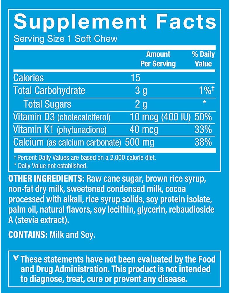 DESCRIPTION : The Vitamin Shoppe Calcium Chews 1,000mg, Chocolate Flavored Chews β Mineral Essential for Healthy Bones & Teeth, No Artificial Sweeteners β with Vitamin K1 & D3 (60 Chews)