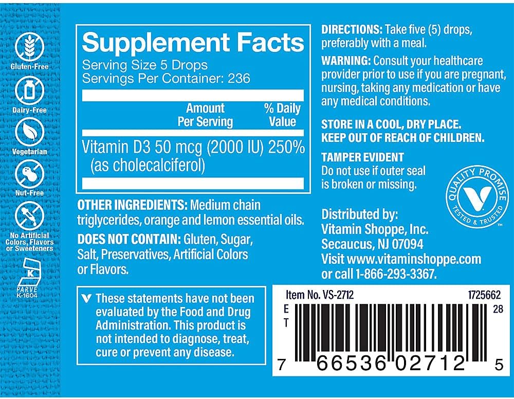 BULLET POINTS : 1 > Liquid Vitamin D-3: A concentrated serving of one of the most important vitamins, just 5 drops of the Vitamin Shoppe Liquid Vitamin D-3 provides 2,000 IU to help you maintain strong, healthy bones