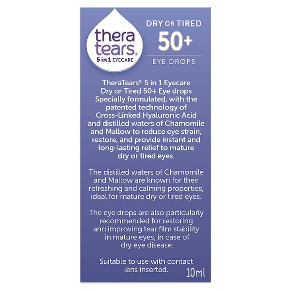 Product Information:50+ Eye Drops With Cross-Linked Hyaluronic Acid And Distilled Waters Of Chamomile And Mallow To Reduce Eye Strain, Restore, And Provide Instant And Long-Lasting Relief To Mature Dry Or Tired Eyes,Features:Instant And Long-Lasting Relief For Mature Dry Or Tired Eyes *Contains Distilled Waters Of Chamomile &Amp; Mallow *Refreshes And Calms Mature Dry Or Tired Eyes *Restores And Improves Tear Film Stability In Mature Eyes *Reduces Eye Strain *Preservative Free *Contact Lens Friendly,Warning Or Restrictions:Strictly Personal Use Only; - Ophthalmic Use Only; - Do Not Use The Product If The Container Is Damaged Or Unsealed When First Purchased; - During Application, Do Not Touch The Eye Or Any Other Surface With The Tip Of The Applicator; - Immediately After Application, The Vision May Be Slightly Impaired For A Short Time; - Not Recommended For Patients Who Are Hypersensitive To Any Components In The Formulation; - If Side Effects Occur During Use, Stop Using The Product And Consult A Doctor; - Do Not Use After The Expiry Date Shown On The Pack; - Dispose Of Container Correctly After Use; - Keep Out Of Reach Of Children,Product Specification:Chamomile Distilled Water, Mallow Distilled Water, Cross-Linked Sodium Hyaluronate Aqueous Solution (Of Which 0.3% Cross-Linked Sodium Hyaluronate), Sodium Phosphate Dibasic Dodecahydrate, Sodium Phosphate Monobasic Monohydrate, Sodium Chloride, Water For Injections. Contains No Preservatives,Product Uses:Wash Hands Thoroughly. Tear Off The Tamper-Evident Seal Before First Use. Remove The Protective Cap And Open The Bottle. Tilt Head Back And Gently Squeeze 2 Drops Into Each Eye Unless Otherwise Prescribed. As The Bottle Empties, It May Be Necessary To Squeeze The Bottle Harder Due To The Properties Of The Closure System. After Use, Shake The Bottle To Eliminate Any Residual Drops On The Applicator Before Replacing The Cap Immediately. The Content Should Be Used Within The Next 3 Months, From First Opening