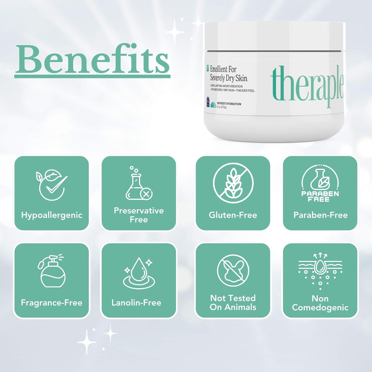 About this item INTENSIVE HYDRATION - Experience unparalleled moisture with our emollient cream. Our body cream for dry skin is specifically formulated for severely dry skin. Achieve long-lasting moisturization with a thicker feel, ensuring your skin stays hydrated. FORMULATED FOR ALL SKIN TYPES - No matter your skin type, our dry skin cream is the perfect solution for severe dryness (including hands, feet, elbows & knees). Gluten-free and lanolin-free cream addresses specific concerns while remaining universally suitable. FRAGRANCE-FREE COMFORT - Enjoy our fragrance-free moisturizing hand cream and Face cream. Embraces a scent-free approach and delivers powerful hydration. PREMIUM INGREDIENTS - Crafted with a blend of special fraction petrolatum, Cyclomethicone, and ozokerite wax. Our hand cream for dry hands ensures effective and targeted hydration for optimal skin health to treat with chronic skin conditions such as psoriasis, eczema, xerosis & ichthyosis. DERMATOLOGIST RECOMMENDED - Trust in the expertise of dermatologists who recommend body cream for extremely dry skin. This moisturizer is a testamental powerful formulation, making it a top choice for skincare. NATIONAL ECZEMA ASSOCIATION SEAL - This distinguished seal serves as a recognized endorsement, affirming the product's proven effectiveness in providing relief and support for individuals with eczema-prone skin. See more product details,INTENSIVE HYDRATION - Experience unparalleled moisture with our emollient cream. Our body cream for dry skin is specifically formulated for severely dry skin. Achieve long-lasting moisturization with a thicker feel, ensuring your skin stays hydrated,FORMULATED FOR ALL SKIN TYPES - No matter your skin type, our dry skin cream is the perfect solution for severe dryness (including hands, feet, elbows & knees). Gluten-free and lanolin-free cream addresses specific concerns while remaining universally suitable,FRAGRANCE-FREE COMFORT - Enjoy our fragrance-free moisturizing hand cream and Face cream. Embraces a scent-free approach and delivers powerful hydration,PREMIUM INGREDIENTS - Crafted with a blend of special fraction petrolatum, Cyclomethicone, and ozokerite wax. Our hand cream for dry hands ensures effective and targeted hydration for optimal skin health to treat with chronic skin conditions such as psoriasis, eczema, xerosis & ichthyosis,DERMATOLOGIST RECOMMENDED - Trust in the expertise of dermatologists who recommend body cream for extremely dry skin. This moisturizer is a testamental powerful formulation, making it a top choice for skincare,NATIONAL ECZEMA ASSOCIATION SEAL - This distinguished seal serves as a recognized endorsement, affirming the product's proven effectiveness in providing relief and support for individuals with eczema-prone skin