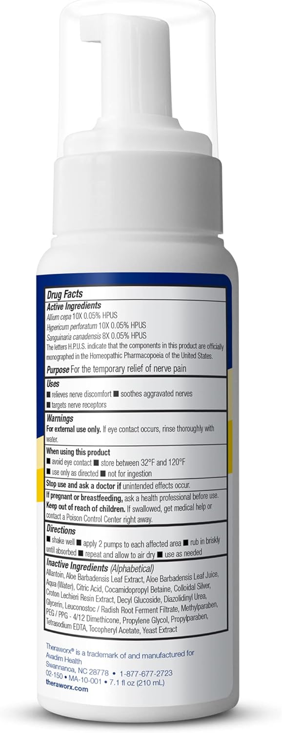 Helps soothe aggravated nerves and relieve discomfortTargets multiple nerve receptorsFast-acting and absorbs quicklyNon-greasy, non-oily, no strong odorMade with natural ingredients, safe to use dailyTheraworx Fast-Acting Nerve Relief Foam Aggravated Nerve Discomfort Relief - 7.1 oz - 1 Count