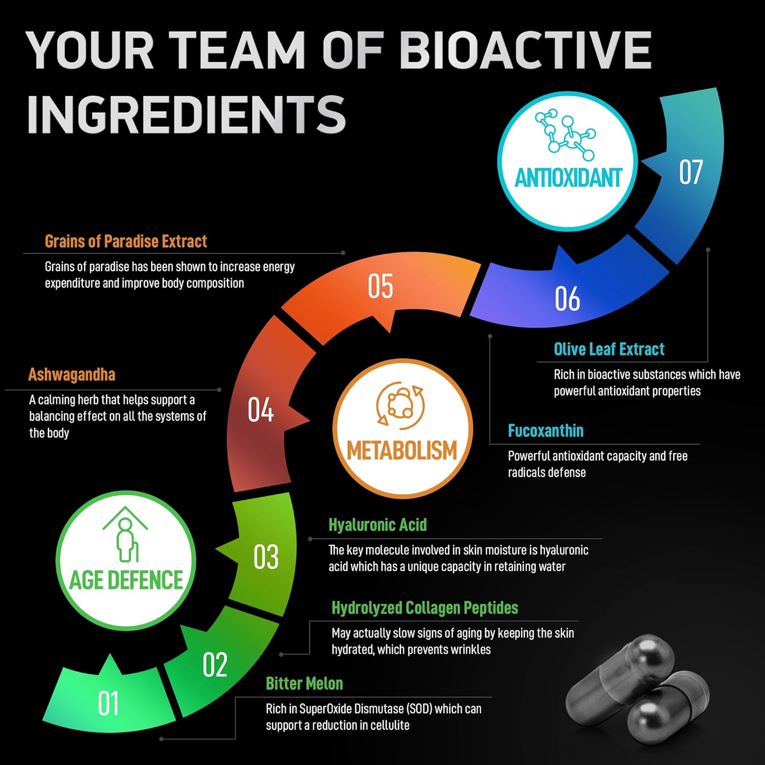 About this item COLLAGEN FOR CELLULITE DEFENSE. Includes SOD melon extract, a powerful ingredient for cellulite reduction. This advanced collagen complex is enriched with hyaluronic acid and vitamin C, two key components that work together to deeply nourish, hydrate, and rejuvenate the skin. COMPLETE MULTI COLLAGEN COMPLEX type I, II, III, V, X. Including grass fed collagen (bovine), marine collagen, chicken and eggshell collagen & multiple active superfood ingredients like olive leaf extract and fucoxanthin. SUPPORTING YOUTHFUL SKIN. Natural collagen stores deplete as we age, leading to wrinkles and dehydrated skin. Packed with high levels of collagen peptides, hyaluronic acid and vitamin C, designed to promote quicker hair and nail growth, along with radiant, youthful skin. YOUR AGE-DEFENSE HERO. Includes ingredients like Grains of Paradise seeds, which can support metabolic function, and calming Ashwagandha, making this collagen supplement a well-rounded addition to your daily wellness routine. MADE IN USA with premium global materials. Convenient, easy-swallow multi collagen peptide capsules, that spell the end for messy collagen powder or collagen pills. Non-GMO, gluten-free collagen supplement capsules are made in cGMP facilities with 3rd party testing for your safety, quality assurance, and peace of mind. › See more product details,COLLAGEN FOR CELLULITE DEFENSE. Includes SOD melon extract, a powerful ingredient for cellulite reduction. This advanced collagen complex is enriched with hyaluronic acid and vitamin C, two key components that work together to deeply nourish, hydrate, and rejuvenate the skin,COMPLETE MULTI COLLAGEN COMPLEX type I, II, III, V, X. Including grass fed collagen (bovine), marine collagen, chicken and eggshell collagen & multiple active superfood ingredients like olive leaf extract and fucoxanthin,SUPPORTING YOUTHFUL SKIN. Natural collagen stores deplete as we age, leading to wrinkles and dehydrated skin. Packed with high levels of collagen peptides, hyaluronic acid and vitamin C, designed to promote quicker hair and nail growth, along with radiant, youthful skin,YOUR AGE-DEFENSE HERO. Includes ingredients like Grains of Paradise seeds, which can support metabolic function, and calming Ashwagandha, making this collagen supplement a well-rounded addition to your daily wellness routine,MADE IN USA with premium global materials. Convenient, easy-swallow multi collagen peptide capsules, that spell the end for messy collagen powder or collagen pills. Non-GMO, gluten-free collagen supplement capsules are made in cGMP facilities with 3rd party testing for your safety, quality assurance, and peace of mind