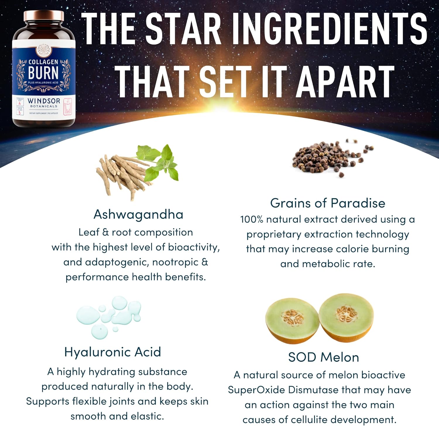 About this item High-potency thermogenic collagen complex supplement for men and women. Packed with powerful marine collagen types (1,2,3,5 and 10) plus metabolism function support grains of paradise seeds. Convenient and easily swallowed daily metabolism, anti-aging and cellulite support. Scientifically blended, ethically-sourced multi collagen pills for dynamic all-around health and fitness support. Skin, hair and nails aging defense. With the most bioactive collagen types, plus hyaluronic acid to help keep skin looking younger and free of wrinkles. Hydrolyzed Collagen Capsules support growth of stronger hair and nails. Includes cellulite targeting SOD (superoxide dismutase) melon. Research shows this may support cellulite reduction and help protect against the two main causes of cellulite development. Support for body and mind. Includes Sensoril Ashwagandha with high level adaptogenic and nootropic brain function benefits. With grass fed bovine, wild-caught fish collagen and chicken collagen. See more product details,High-potency thermogenic collagen complex supplement for men and women. Packed with powerful marine collagen types (1,2,3,5 and 10) plus metabolism function support grains of paradise seeds,Convenient and easily swallowed daily metabolism, anti-aging and cellulite support. Scientifically blended, ethically-sourced multi collagen pills for dynamic all-around health and fitness support,Skin, hair and nails aging defense. With the most bioactive collagen types, plus hyaluronic acid to help keep skin looking younger and free of wrinkles. Hydrolyzed Collagen Capsules support growth of stronger hair and nails,Includes cellulite targeting SOD (superoxide dismutase) melon. Research shows this may support cellulite reduction and help protect against the two main causes of cellulite development,Support for body and mind. Includes Sensoril Ashwagandha with high level adaptogenic and nootropic brain function benefits. With grass fed bovine, wild-caught fish collagen and chicken collagen