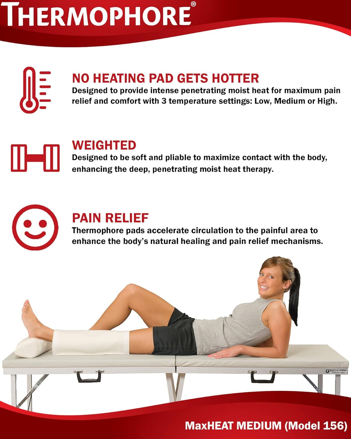 About this item You will receive (1) Thermophore MaxHEAT Moist Heating Pad, Medium Size 14" x 14" UNMATCHED PAIN RELIEF – The weighted heating pad is pliable, designed to maximize contact with the body. Drug free pain relief, great for: neck, shoulder, back, hip, leg, knee, muscles, chest congestion, period and menstrual cramps. Also, great when used with Fascia Blaster. MACHINE WASHABLE COVER – The specially blended, removable cover absorbs moisture from the air, is washable and non-shedding. No additional water or wet towel needed for moist heat. CONSTANT-COMFORT - Three-temperature comfort switch (max temperature up to 180°F) with automatic 25-minute auto-off timer. Recommended application time: 15 - 20 minutes at a time. Thermophore heating pads provide the ultimate comfort and pain relief. Moist heat Heats fast Cleans easily See more product details,You will receive (1) Thermophore MaxHEAT Moist Heating Pad, Medium Size 14" x 14",UNMATCHED PAIN RELIEF – The weighted heating pad is pliable, designed to maximize contact with the body. Drug free pain relief, great for: neck, shoulder, back, hip, leg, knee, muscles, chest congestion, period and menstrual cramps. Also, great when used with Fascia Blaster,MACHINE WASHABLE COVER – The specially blended, removable cover absorbs moisture from the air, is washable and non-shedding. No additional water or wet towel needed for moist heat,CONSTANT-COMFORT - Three-temperature comfort switch (max temperature up to 180°F) with automatic 25-minute auto-off timer. Recommended application time: 15 - 20 minutes at a time,Thermophore heating pads provide the ultimate comfort and pain relief,Moist heat,Heats fast,Cleans easily