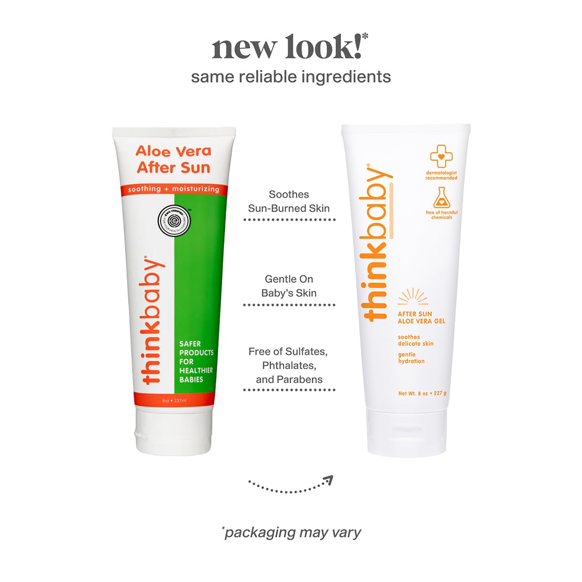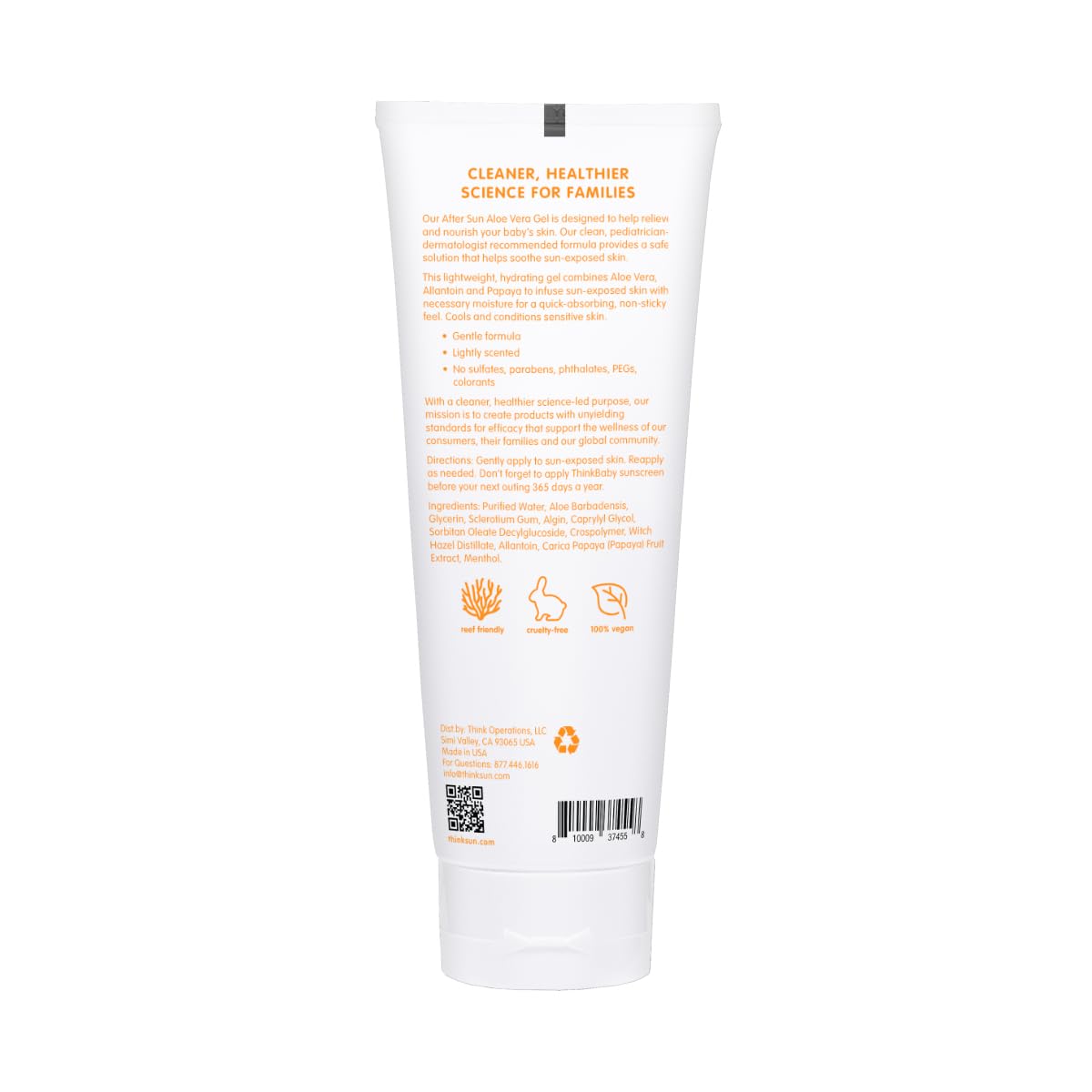 Thinkbaby Aloe Vera After Sun Too much fun at the pool or beach Lost track of time on your walk Sunburn leaves your baby’s skin hot, red and sore and we all know it’s to be avoided. But here we are with an overexposure, so we created Aloe Vera After Sun Gel to help provide some quick relief. Thinkbaby Aloe Vera After Sun was created to provide a safe, natural solution for sunburned skin care without the harmful chemicals. Soothing and hydrating, Aloe Vera deeply penetrates sun exposed skin, offering fast and effective relief from discomfort. And the natural, non-toxic after sun formulation makes it ideal for sensitive facial skin, kids and even babies. Just gently apply the cooling after sun skincare gel on your little one’s overexposed skin, and reapply as needed for comfort and relief. And don't forget to apply their Thinkbaby sunscreen before your next outing! Clean, Natural & Environmentally Friendly Thinkbaby after sun is free of biologically harmful chemicals and contains only safe, natural ingredients that are based on Whole Foods Premium Care requirements. The sunburn relief gel has EWG Verified certification and meets the strictest standards for children’s health. Formulated with decolorized Aloe Vera Extract, the baby sunburn relief solution contains no parabens, phthalates, 1,4 dioxane, sodium lauryl sulfate, PEGs, colorants or toxic chemicals. As Leaping Bunny members, our vegan sun care formula has no animal by-products or testing. Our sun protection products do not contain any chemicals known to harm coral reefs, and are supplied in a recyclable tube made of environmentally friendly packaging that does not contain BPA, vinyl, or phthalatesAFTER SUN RELIEF: Too much time at the beach Thinkbaby Aloe Vera gel provides effective after sun relief for all skin types - even your baby or toddler’s sensitive skin. Suitable for facial skin as well as the body, the sun care gel can be reapplied to your little one as neededSOOTHING & HYDRATING: Natural Aloe Vera moisturizes and soothes skin after sun exposure, providing fast relief from uncomfortable red, hot and sore sunburned skin. Cooling and hydrating, the body and face gel is quick and easy to apply to wriggly babiesCLEAN, NATURAL FORMULA: Our after sun skincare gel’s formulation is based on Whole Foods Premium Care ingredients along with our scientific expertise in creating more natural sun care products to give your child comfort and you complete peace of mindNON TOXIC & CRUELTY FREE: Vegan and Leaping Bunny certified, our effective sunburn gel has no animal testing or animal products included for a truly cruelty-free skincare solution that’s free of parabens, phthalates, 1,4 dioxane, sodium lauryl sulfate, and biologically harmful chemicals