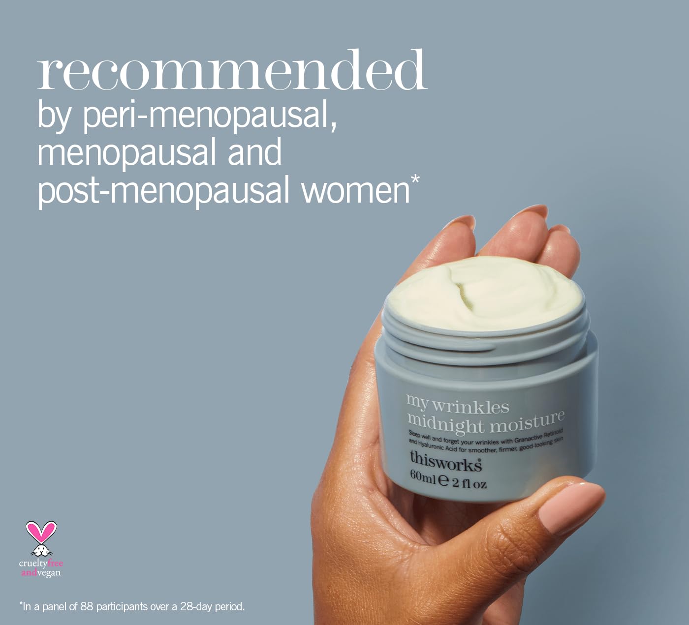 About this item A boosted overnight formula in an indulgently rich cream with an advanced retinoid complex and bakuchiol to help improve skin radiance, reducing roughness and dryness while gradually working on softening the appearance of fine lines and wrinkles. Persian silk tree extract helps support skin's natural repair and cleansing. The my wrinkles Midnight natural fragrance is designed to bring calm and reflection into your evening. Why: Hard-working nighttime skincare for all skin types, proven to help improve skin elasticity and smoothness. When: A luxurious overnight formula that works to support the natural repair processes that take place while you sleep. This comforting and deeply nourishing moisturiser is recommended by peri-menopausal and menopausal women. 98 Percent natural. Cruelty free. Vegan. A 100 Percent natural fragrance will help unwind the mind and prepare you for beauty sleep.  See more product details,A boosted overnight formula in an indulgently rich cream with an advanced retinoid complex and bakuchiol to help improve skin radiance, reducing roughness and dryness while gradually working on softening the appearance of fine lines and wrinkles. Persian silk tree extract helps support skin's natural repair and cleansing. The my wrinkles Midnight natural fragrance is designed to bring calm and reflection into your evening,Why: Hard-working nighttime skincare for all skin types, proven to help improve skin elasticity and smoothness,When: A luxurious overnight formula that works to support the natural repair processes that take place while you sleep,This comforting and deeply nourishing moisturiser is recommended by peri-menopausal and menopausal women,98 Percent natural. Cruelty free. Vegan. A 100 Percent natural fragrance will help unwind the mind and prepare you for beauty sleep