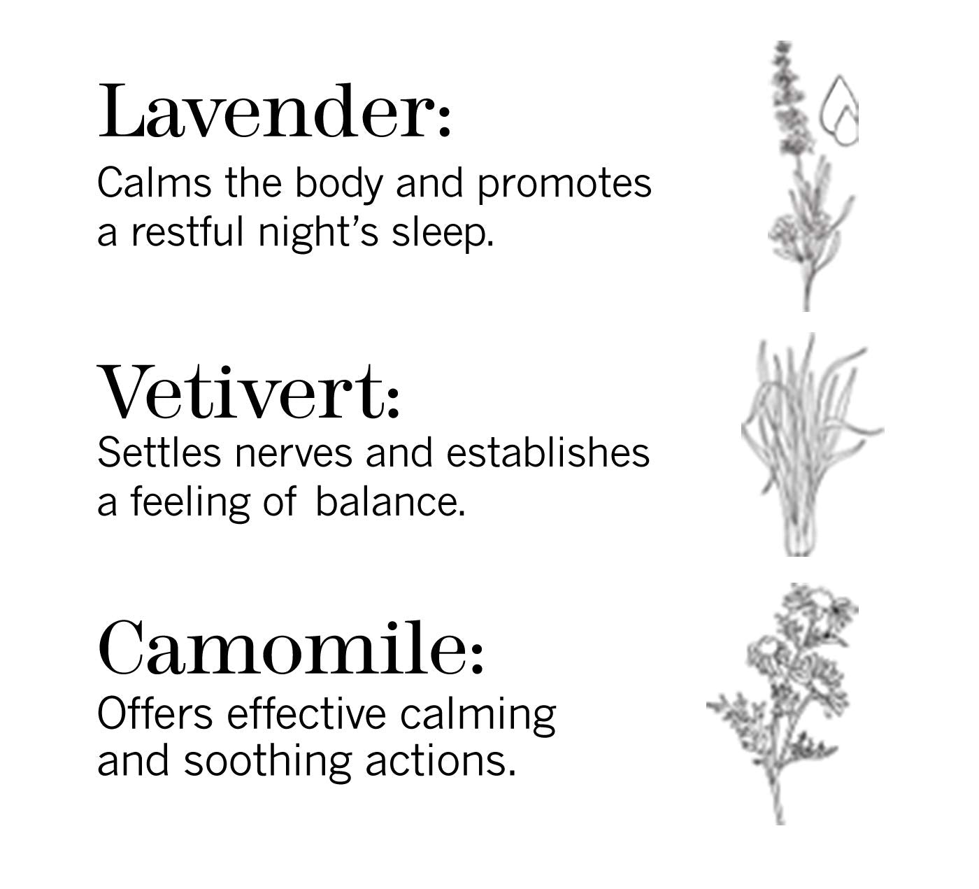 Our natural, aromatherapeutic Superblend of Lavender, Camomile, and Vetivert calms both mind and body, soothing you to rest. Simply spritz your pillow before your slumber