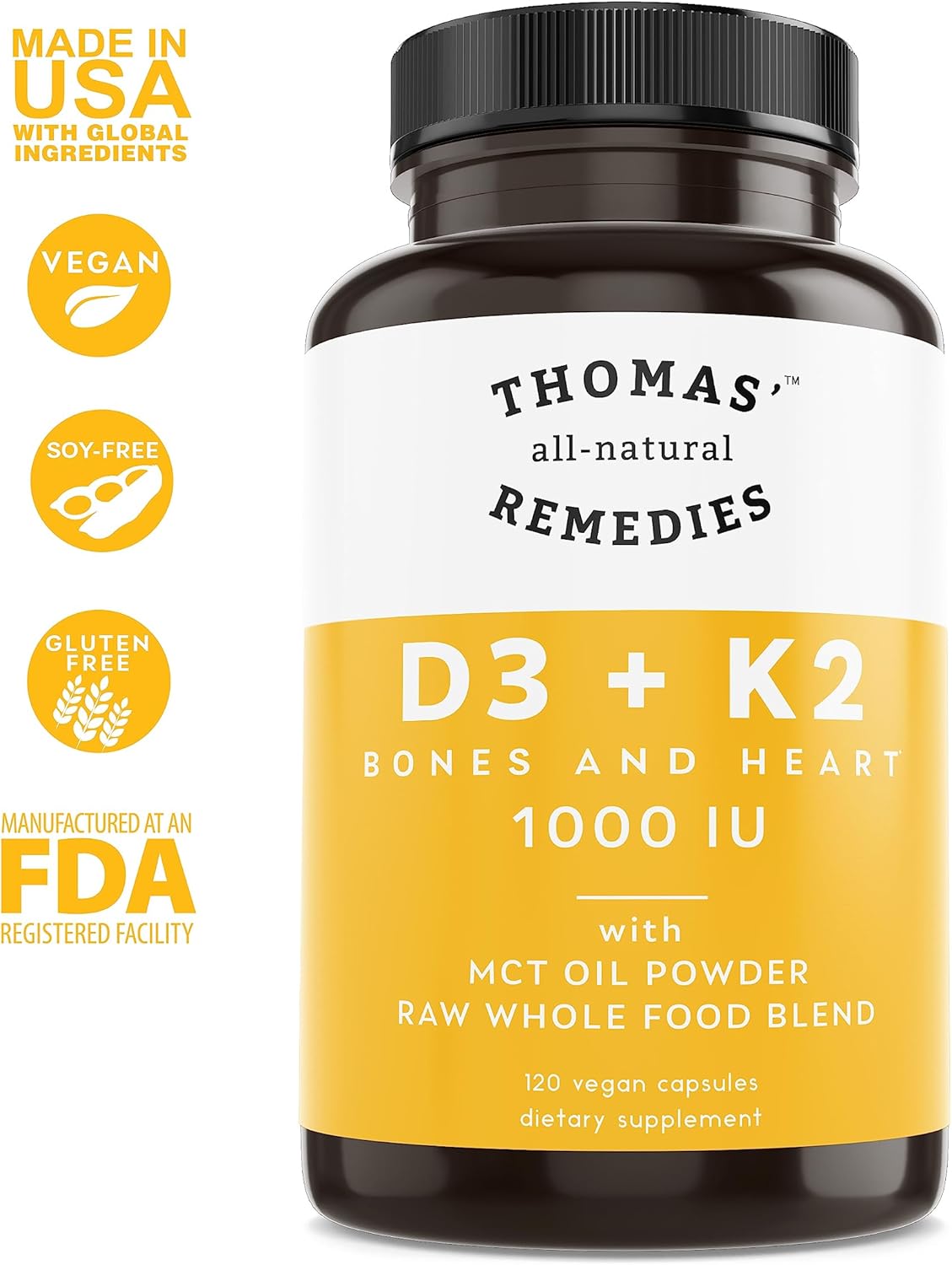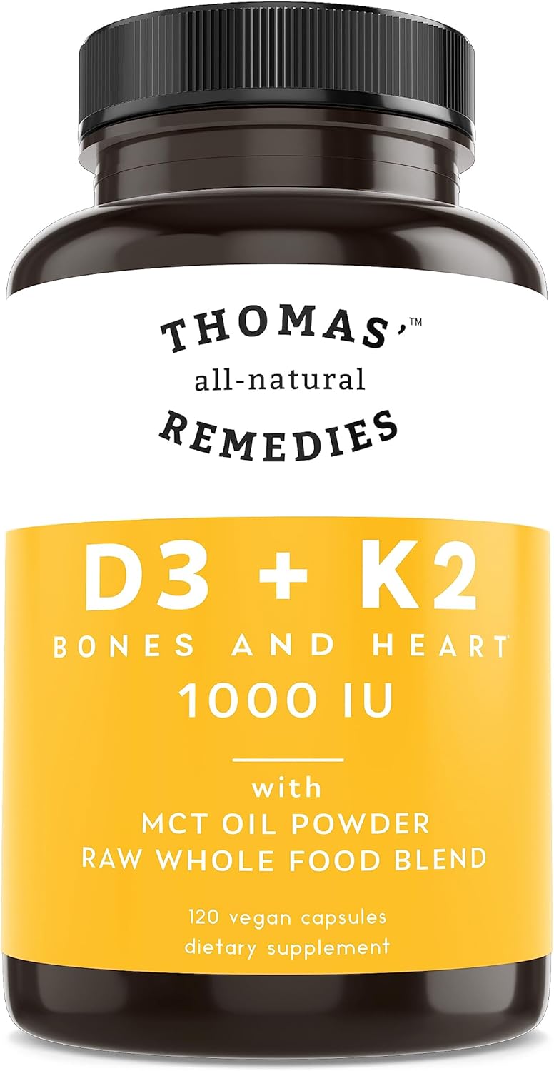 Thomas' All-Natural Remedies D3 + K2 With Mct Oil For Better Absorption & Raw Whole Food Blend, 1000 Iu D3, Vegan, Made In Usa, Support For Your Heart, Bones & Teeth, Non-Gmo (120Ct)