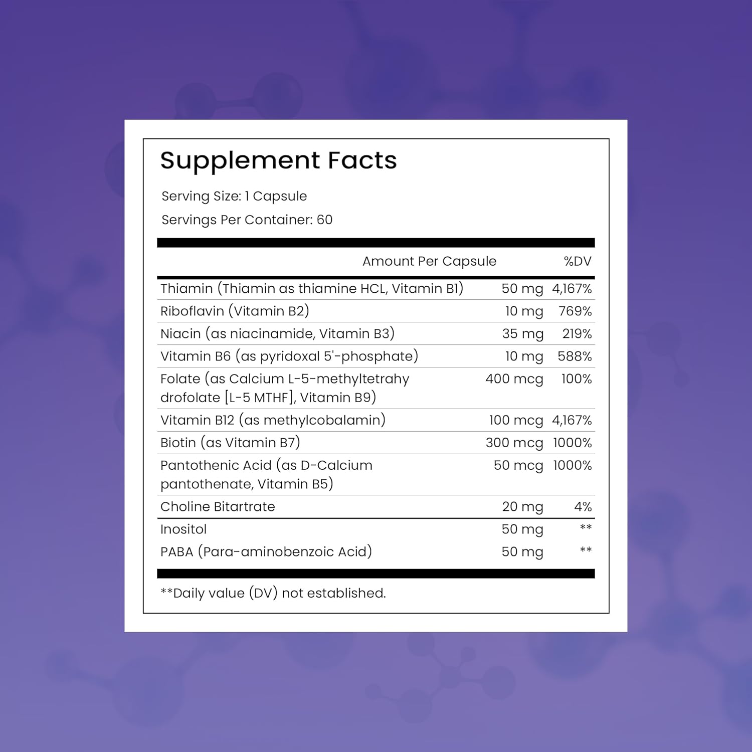 About this item Complete B Vitamin Blend β Features a full spectrum of B vitamins, including B1 through B12, combined with Choline, PABA, and Inositol. Vegan & All-Natural Formula β Made with plant-based ingredients and free from artificial additives, preservatives, gluten, and soy. Convenient Daily Capsules β Easy-to-swallow capsules designed for everyday use at home or on the go. Balanced Nutritional Support β A practical addition to your daily routine to help maintain overall wellness. Made in the USA β Manufactured in a facility that follows strict quality standards to ensure consistency and purity. See more product details,Complete B Vitamin Blend β Features a full spectrum of B vitamins, including B1 through B12, combined with Choline, PABA, and Inositol,Vegan & All-Natural Formula β Made with plant-based ingredients and free from artificial additives, preservatives, gluten, and soy,Convenient Daily Capsules β Easy-to-swallow capsules designed for everyday use at home or on the go,Balanced Nutritional Support β A practical addition to your daily routine to help maintain overall wellness,Made in the USA β Manufactured in a facility that follows strict quality standards to ensure consistency and purity
