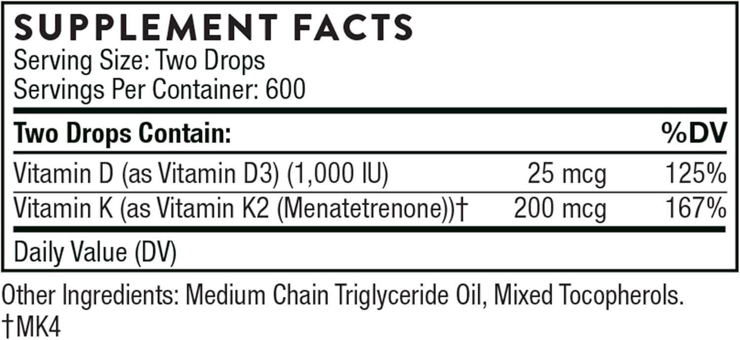 Metered Dispenser: Thorne Vitamin D + K2 Liquid Includes A Self-Dispensing Top For Precise Dosing, Ensuring Accurate Intake With Every Use
