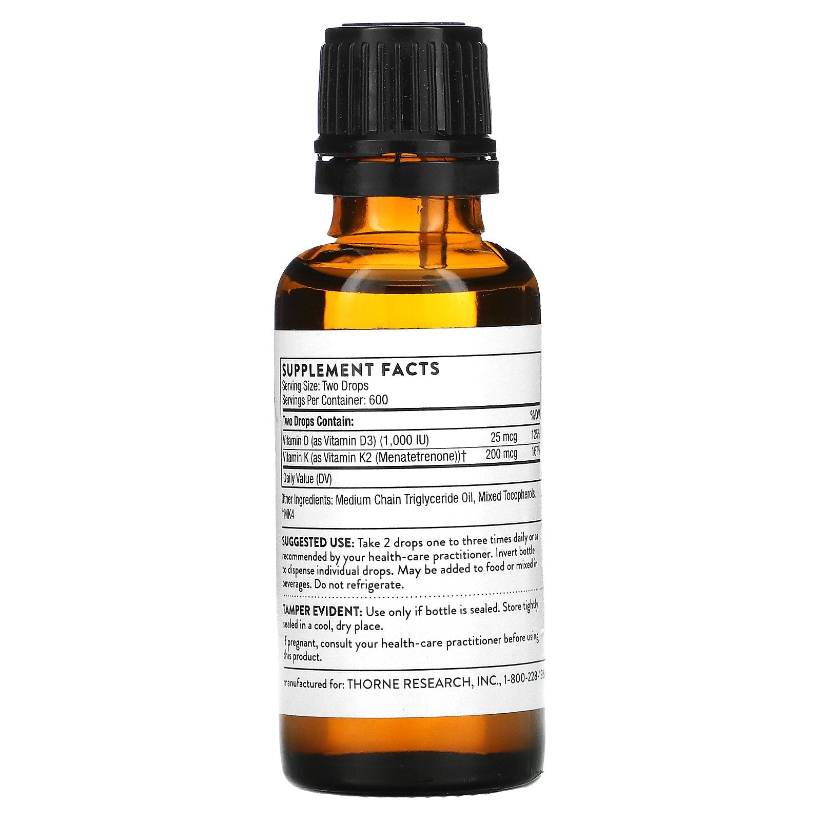 Both vitamin D and vitamin K2 support bone and muscle health, along with cardiovascular health and immune function. It is important to maintain an optimal level of vitamin D in the body through all stages of life, from fetal development to old age. Vitamin K2, a series of molecules known as menaquinones, exerts a more powerful influence on bone than does vitamin K1. The vitamin K2 in this formula is the well-studied MK-4. Combining vitamins D and K can provide greater support of the immune and cardiovascular systems than each offers separately. For example, vitamin D is necessary for calcium absorption, and vitamin K is important for directing calcium to the bones and away from the soft tissues, such as blood vessels and kidneys. Thorne's Vitamin D/ K2 Liquid also provides nutritional support for oncology patients.