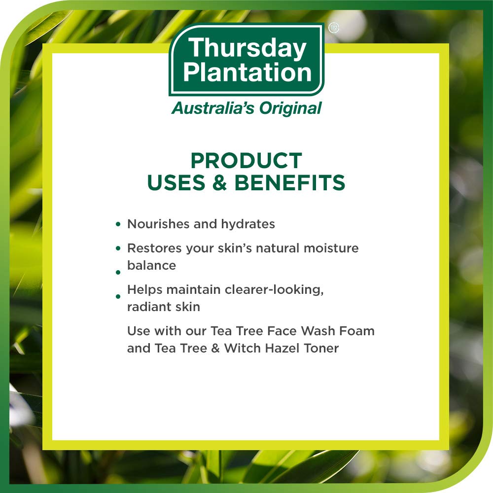 About this item NOURISH YOUR SKIN - Hydrates the skin's natural moisture balance, is non-comedogenic so it won’t clog pores and easily absorbs into skin without oily residue. FORMULATED WITH NATURAL MOISTURIZERS - This face moisturizer is 95% naturally derived with ingredients including Macadamia Oil, Rose Hip Oil, Vitamin E and Shea Butter to hydrate, soothe and soften the skin. DERMATOLOGICALLY TESTED - Our face cream is gentle, making it ideal for those with acne-prone skin. NO HARSH CHEMICALS – Plant based moisturizer without parabens, phthalates, SLS, mineral oil and petrolatum, as well as sulfate-free, cruelty free and 100% vegan. OUR TEA TREE OIL –Since 1976 Thursday Plantation has been producing 100% Pure Australian native Melaleuca alternifolia Tea Tree Oil, which undergoes comprehensive testing to ensure its authenticity and purity, guaranteeing a quality, pure and unadulterated oil.  See more product details,NOURISH YOUR SKIN - Hydrates the skin's natural moisture balance, is non-comedogenic so it won’t clog pores and easily absorbs into skin without oily residue,FORMULATED WITH NATURAL MOISTURIZERS - This face moisturizer is 95% naturally derived with ingredients including Macadamia Oil, Rose Hip Oil, Vitamin E and Shea Butter to hydrate, soothe and soften the skin,DERMATOLOGICALLY TESTED - Our face cream is gentle, making it ideal for those with acne-prone skin,NO HARSH CHEMICALS – Plant based moisturizer without parabens, phthalates, SLS, mineral oil and petrolatum, as well as sulfate-free, cruelty free and 100% vegan,OUR TEA TREE OIL –Since 1976 Thursday Plantation has been producing 100% Pure Australian native Melaleuca alternifolia Tea Tree Oil, which undergoes comprehensive testing to ensure its authenticity and purity, guaranteeing a quality, pure and unadulterated oil