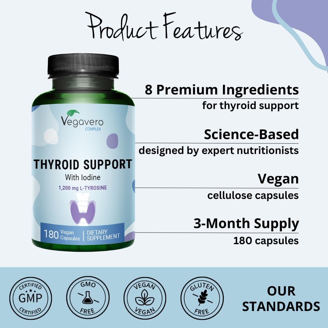 About this item THYROID SUPPORT FOR WOMEN & MEN : Our thyroid supplement contains iodine, selenium, L tyrosine, copper, folate, vitamin B12 and zinc to provide nutritional support for normal thyroid activity, energy levels, and overall wellness. ADAPTOGENIC BLEND FOR THYROID HEALTH: Our thyroid complex includes ashwagandha root, a natural adaptogen traditionally used in Ayurveda to help the body adapt to occasional stress and support overall balance and vitality. SCIENCE-DRIVEN: Developed by nutritionists and designed with a focus on the latest nutritional research, our formula Thyroid Care (selenium zinc iodine l-tyrosine ashwagandha) is designed to align with your body’s natural systems. HIGH QUALITY: Our Thyroid Support Complex is manufactured in a GMP (Good Manufacturing Practice) certified facility in the USA. Unlike most thyroid supplements in the market, our product is vegan and free from artificial fillers and binders. BY YOUR SIDE: Caring for you is part of our philosophy. Our team of nutrition scientists create unique formulas to achieve the perfect synergy of ingredients and dosages for your needs. If you have any queries, we are happy to advise and support you in your goals, and/or provide you with the certifications of each product and to answer all your questions. Plus, we offer a full refund on your purchase if you're not entirely satisfied. Vegavero – from Nature, with Passion, for You. See more product details,THYROID SUPPORT FOR WOMEN & MEN : Our thyroid supplement contains iodine, selenium, L tyrosine, copper, folate, vitamin B12 and zinc to provide nutritional support for normal thyroid activity, energy levels, and overall wellness,ADAPTOGENIC BLEND FOR THYROID HEALTH: Our thyroid complex includes ashwagandha root, a natural adaptogen traditionally used in Ayurveda to help the body adapt to occasional stress and support overall balance and vitality,SCIENCE-DRIVEN: Developed by nutritionists and designed with a focus on the latest nutritional research, our formula Thyroid Care (selenium zinc iodine l-tyrosine ashwagandha) is designed to align with your body’s natural systems,HIGH QUALITY: Our Thyroid Support Complex is manufactured in a GMP (Good Manufacturing Practice) certified facility in the USA. Unlike most thyroid supplements in the market, our product is vegan and free from artificial fillers and binders,BY YOUR SIDE: Caring for you is part of our philosophy. Our team of nutrition scientists create unique formulas to achieve the perfect synergy of ingredients and dosages for your needs. If you have any queries, we are happy to advise and support you in your goals, and/or provide you with the certifications of each product and to answer all your questions. Plus, we offer a full refund on your purchase if you're not entirely satisfied. Vegavero – from Nature, with Passion, for You