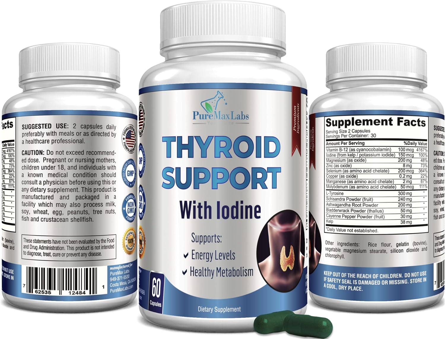 About this item ENERGY & METABOLISM BOOSTER FORMULA - Our Thyroid Support supplement supports healthy thyroid function which supports a healthy metabolism and energy level. This can help give you feel more energized and can function as a metabolism booster. SUPPORTS FOCUS & CLARITY - Our Thyroid Support supplement helps get rid of brain fog. When your thyroid is given the support it needs, you will be amazed at how well you can concentrate and focus. A healthy Thyroid is the key to a healthy brain. WAKE UP RESTED & ENERGIZED - Our Thyroid supplement will help give your thyroid gland the nutrients it needs, helping you wake up more rested and energized giving you more energy throughout your day. PureMax Labs Thyroid Support is manufactured in the USA in an FDA inspected, Good Manufacturing Practice Certified facility from premium non-GMO ingredients and is 3rd party lab tested. See more product details,ENERGY & METABOLISM BOOSTER FORMULA - Our Thyroid Support supplement supports healthy thyroid function which supports a healthy metabolism and energy level. This can help give you feel more energized and can function as a metabolism booster,SUPPORTS FOCUS & CLARITY - Our Thyroid Support supplement helps get rid of brain fog. When your thyroid is given the support it needs, you will be amazed at how well you can concentrate and focus. A healthy Thyroid is the key to a healthy brain,WAKE UP RESTED & ENERGIZED - Our Thyroid supplement will help give your thyroid gland the nutrients it needs, helping you wake up more rested and energized giving you more energy throughout your day,PureMax Labs Thyroid Support is manufactured in the USA in an FDA inspected, Good Manufacturing Practice Certified facility from premium non-GMO ingredients and is 3rd party lab tested
