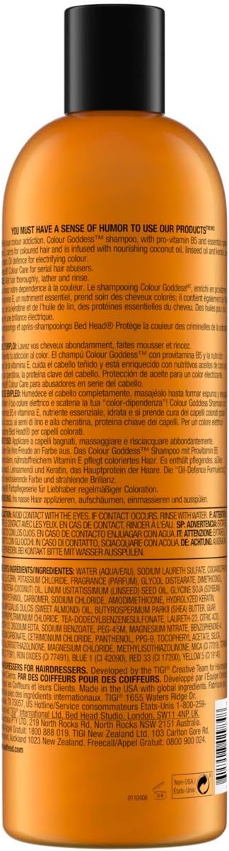 Product Description BedHead colour goddess shampoo and conditioner tween duo pack for racy red heads and bodacious brunettes. With the delicious fragrance of Toffee Heaven this TIGI shampoo battles hair fading and dulling as well as preventing hair dryness. Colour LockDown Technology protects colour vibrancy longer. Not only does it shield from untimely colour loss this sulphate free shampoo smoothes and shines like no other while helping to protect against UV damage. Your hair will leave them mesmerised. To Use Work into lather on wet hair. Rinse well. To keep your rich colour longer follow up with colour goddess conditioner. Keep those dark chocolate and sweet cherry hues as delicious as the day you put them in. Fragranced with the delicious scent of Toffee Heaven TIGI Bed Head Colour LockDown Technology prevents premature colour fading for Racy Red Heads and Bodacious Brunettes as it battles hair fading and dulling and prevents hair dryness. Not only does it shield from untimely colour loss TIGI Bed Head Colour Goddess Conditioner will boost shine and softness while locking in essential moisture and protecting against thermal damage. Beautiful hair is your dream come true. Ingredients Enriched with pro-vitamin B5, vitamin E, sweet almond oil, coconut oil and keratin. P.when('A').execute(function(A) { A.on('a:expander:toggle_description:toggle:collapse', function(data) { window.scroll(0, data.expander.$expander[0].offsetTop-100); }); }); Directions Lather it on wet hair. Rinse thoroughly. Then use Colour Goddess Conditioner. Box Contains Each order comes with 1 x Tigi Bed Head Colour Shampoo and Conditioner Goddess System Tween Set 750 ml See more,Protects colour from fading,Conditions and de-tangles,Increases compatibility and slip,Rich caramel brown and spicy red hues as delicious as the day,Shampoo battles hair fading and dulling as well as preventing hair dryness