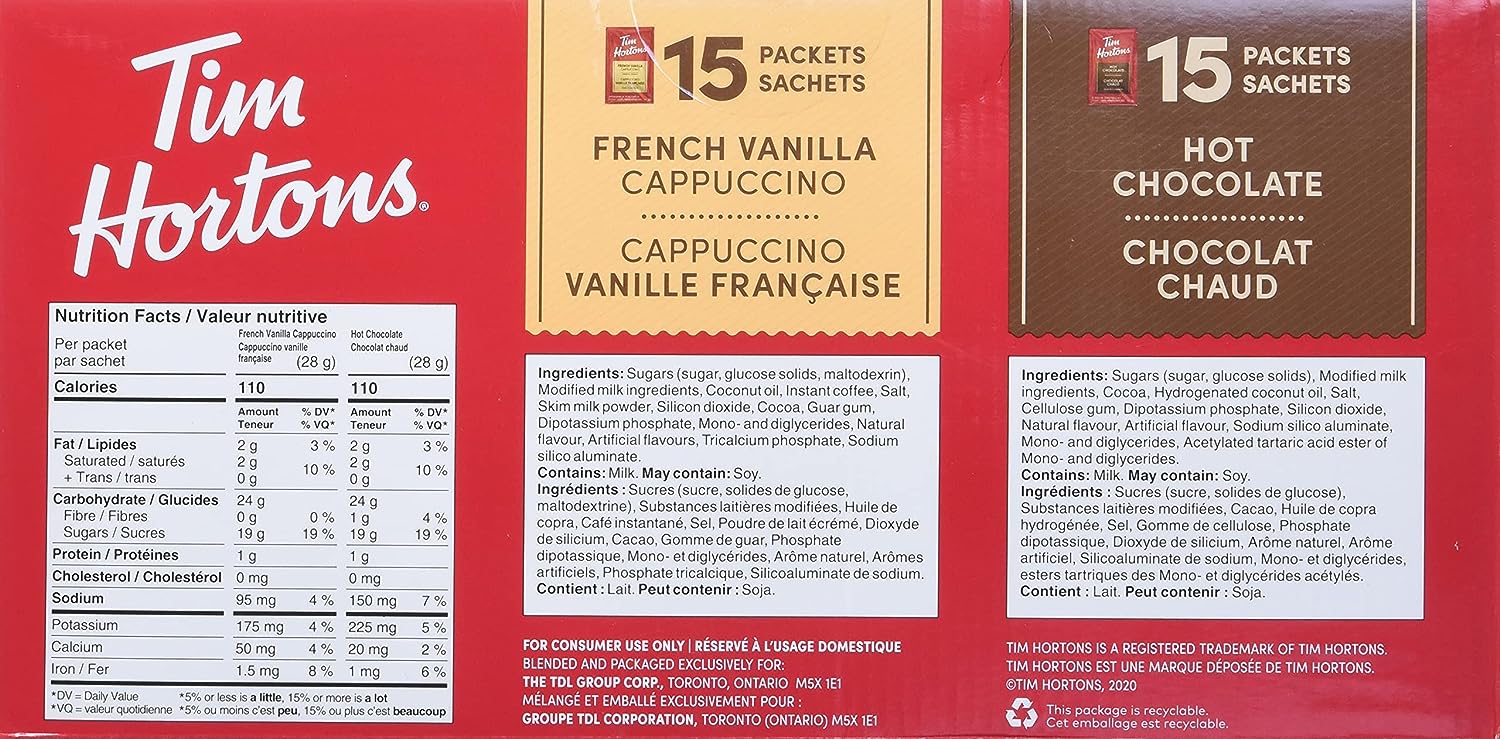 Tim Hortons Hot Chocolate Assorted Variety, French Vanilla & Cappuccino, 15 Packets (Imported From Canada)