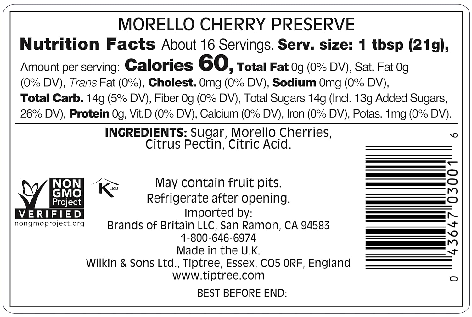 About this item Easy to spread, enjoy this preserve on toast, biscuits, muffins, cheese, pastries or even as a cake filling. Ingredients: Sugar, Morello Cherries, Gelling Agent: Citrus Pectin; Acidity Regulator: Citric Acid. Gluten free, made in a nut free factory, suitable for vegetarians and vegans. 12 ounce jar. The Wilkin family has been farming in Tiptree, Essex, since 1757, and making quality preserves since 1885. Majority of the fruit used in Tiptree jars are grown on their own farm, ensuring fruit is hand picked with care at the most optimal time. See more product details,Easy to spread, enjoy this preserve on toast, biscuits, muffins, cheese, pastries or even as a cake filling,Ingredients: Sugar, Morello Cherries, Gelling Agent: Citrus Pectin; Acidity Regulator: Citric Acid. Gluten free, made in a nut free factory, suitable for vegetarians and vegans,12 ounce jar,The Wilkin family has been farming in Tiptree, Essex, since 1757, and making quality preserves since 1885. Majority of the fruit used in Tiptree jars are grown on their own farm, ensuring fruit is hand picked with care at the most optimal time
