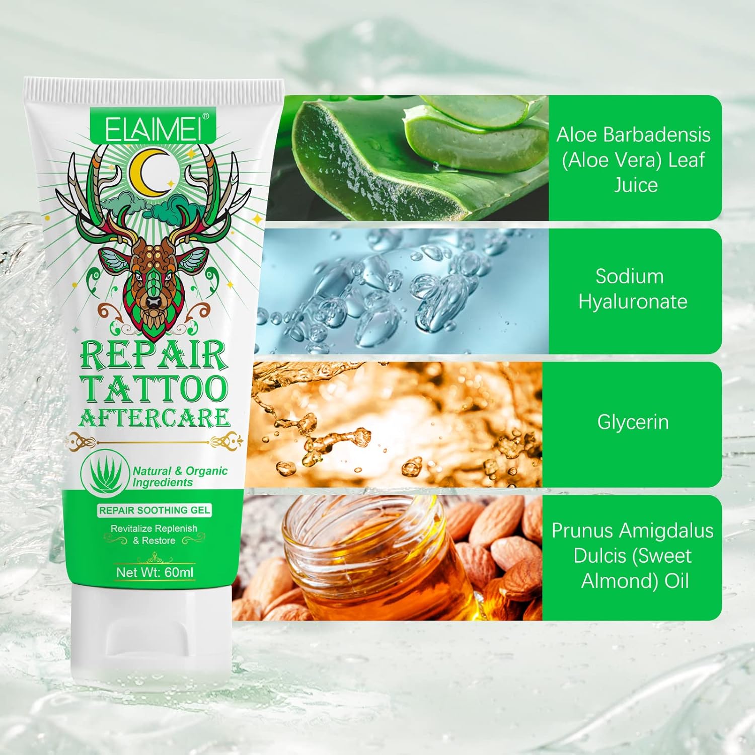 Repair tattoo-ferrycare soothing gel, revitalized and restored damaged skin, natural and organic ingredients. Attention: only for external application, not eat; Avoid direct contact with the eyes. If irritation occurs, please set the use. Keep out of reach of children. Keep the product in this container, store it in a cool, dry place far from sunlight. Application: Clean the hands and treatment area with soap and water, rinse, then gently pat dry. 2. Apply a thick amount of gel to the treated area. 3. Use it twice a day. A more lively tattoo begins with clean, natural ingredients. ELAIMEI TATTOO Soothing gel is her simple tattoo care solution, from soothing new ink to the revival and protection of current ones. Especially made for your tattoo. Brave to hunt. Ingredients of water (aqua), glycerin, propandiol (corn), acetyl hexapeptide-3, panthenol (vitamin B12), bisabolo (anti-oxidant), ascorbic acid (vitamin C), allantoin, arganian spinosa (argan) oi, prunus dulcis ( Sweet Mandel), sodium hyaluronates, retinyl palin. Mitate (vitamin A). ), Aloe barbadensis (aloe vera) leaf juice, planting collages, Xanthum Gum, carbomer, triethanolamine, ethylhexyglycerin, phenoxyethanol, fragrance,TATTOO AFTERCARE ESSENTIAL: Repair tattoo aftercare is the original luxury tattoo aftercare product for new and older tattoos. Safe to use right after getting a tattoo to help heal and reduce irritation unlike others. Makes older tattoos pop and rejuvenates them,A MORE VIBRANT TATTOO STARTS HERE?Formulated With Clean, Natural Ingredients, Elaimei Tattoo Soothing Gel Is Your Easy Tattoo Care Solution, From Soothing New Ink To Reviving & Protecting Current Ones. Specifically Crafted For Your Tattoo. Bold to chase yourself?,NATURAL VEGAN INGREDIENTS: Certified cruelty-free, absolutely vegan, our all-natural butter is also petroleum, paraben free. It is made from only the finest ingredients, Natural aloe vera gel ingredients for a more authentic tattoo,GOOD MOISTURISING EFFECT?Tattoo Balm is rich in moisturising natural ingredients such as aloe vera gel and can be used to moisturise not only the tattoo area but also the rest of the skin,24-HOUR SUPPORT: If you have any questions about your order or product, please do not hesitate to correspond with us