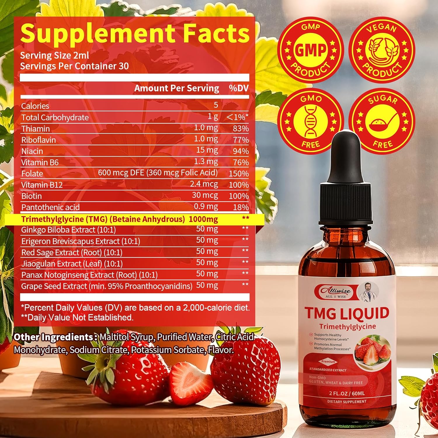 About this item Potent Methylation & Homocysteine Support: Each serving delivers a high-potency 1000mg of Trimethylglycine (TMG), a vital methyl donor. Our TMG liquid drops actively support critical methylation pathways and help maintain healthy homocysteine levels already within the normal range, crucial for overall cellular function and wellness. Advanced Cardiovascular & Heart Health: Promote optimal cardiovascular wellness with our Betaine Anhydrous formula. By supporting healthy homocysteine balance and contributing to blood vessel integrity, this TMG supplement is an excellent choice for individuals seeking natural heart health support and circulatory system maintenance. Comprehensive Antioxidant & Vitality Complex: Beyond TMG's inherent antioxidant properties, this unique formula is enriched with a synergistic herbal blend including Ginkgo Biloba, Rhodiola Rosea, and Grape Seed Extract. This powerful combination helps combat oxidative stress, supports cognitive function, and promotes natural energy levels for enhanced vitality. Enhanced Absorption Liquid Formula with B Vitamins: Experience the benefits faster with our highly bioavailable TMG liquid drops. This easy-to-take format ensures superior absorption compared to pills. Fortified with essential B-Vitamins including B6, B12, and Folate, it further supports methylation processes and overall metabolic health. Clean & Pure for Your Peace of Mind: Trust in Alliwise for a premium quality supplement. Our TMG Liquid is Non-GMO, Gluten-Free, Wheat-Free, and Dairy-Free, with a pleasant natural flavor. Made with carefully selected ingredients to support your health goals without unnecessary additives. See more product details,Potent Methylation & Homocysteine Support: Each serving delivers a high-potency 1000mg of Trimethylglycine (TMG), a vital methyl donor. Our TMG liquid drops actively support critical methylation pathways and help maintain healthy homocysteine levels already within the normal range, crucial for overall cellular function and wellness,Advanced Cardiovascular & Heart Health: Promote optimal cardiovascular wellness with our Betaine Anhydrous formula. By supporting healthy homocysteine balance and contributing to blood vessel integrity, this TMG supplement is an excellent choice for individuals seeking natural heart health support and circulatory system maintenance,Comprehensive Antioxidant & Vitality Complex: Beyond TMG's inherent antioxidant properties, this unique formula is enriched with a synergistic herbal blend including Ginkgo Biloba, Rhodiola Rosea, and Grape Seed Extract. This powerful combination helps combat oxidative stress, supports cognitive function, and promotes natural energy levels for enhanced vitality,Enhanced Absorption Liquid Formula with B Vitamins: Experience the benefits faster with our highly bioavailable TMG liquid drops. This easy-to-take format ensures superior absorption compared to pills. Fortified with essential B-Vitamins including B6, B12, and Folate, it further supports methylation processes and overall metabolic health,Clean & Pure for Your Peace of Mind: Trust in Alliwise for a premium quality supplement. Our TMG Liquid is Non-GMO, Gluten-Free, Wheat-Free, and Dairy-Free, with a pleasant natural flavor. Made with carefully selected ingredients to support your health goals without unnecessary additives