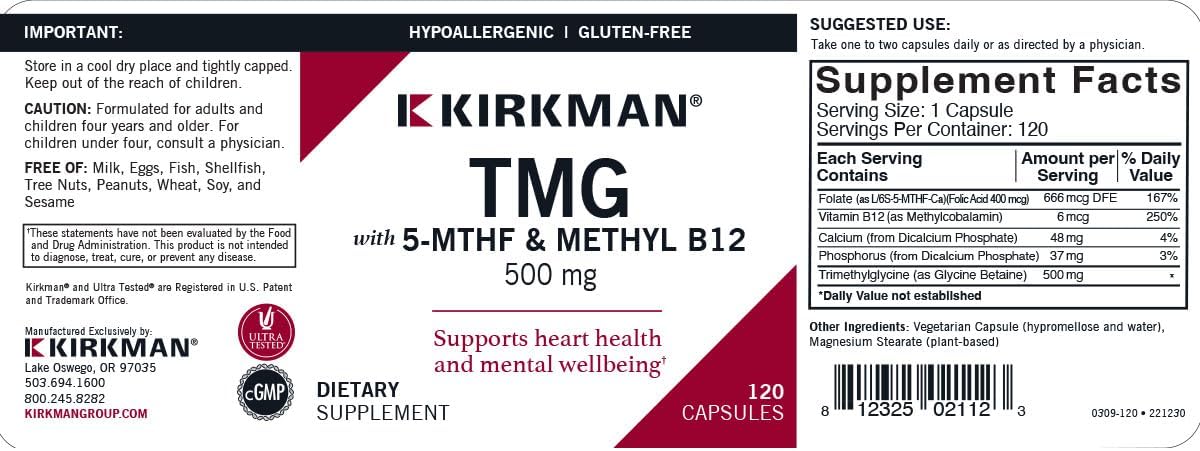 About this item CARDIOVASCULAR SUPPORT: Trimethylglycine (TMG) supports methylation, methionine metabolism, folate chemistry, and is an immune system modulator.* IMMUNE SYSTEM SUPPORT: As an immune support supplement, TMG strengthens the immune system by soothing the adrenal glands in times of stress.* SAFE FOR DAILY USE: Take 1-2 capsules daily or as directed by your physician. PURE QUALITY: Kirkman Ultra Tested standards far exceed industry standards and government requirements.* HYPOALLERGENIC: Does not contain gluten, casein, milk, eggs, peanuts, tree nut allergens, fish allergens, shellfish, soy, wheat, or sesame. See more product details,CARDIOVASCULAR SUPPORT: Trimethylglycine (TMG) supports methylation, methionine metabolism, folate chemistry, and is an immune system modulator,IMMUNE SYSTEM SUPPORT: As an immune support supplement, TMG strengthens the immune system by soothing the adrenal glands in times of stress,SAFE FOR DAILY USE: Take 1-2 capsules daily or as directed by your physician,PURE QUALITY: Kirkman Ultra Tested standards far exceed industry standards and government requirements,HYPOALLERGENIC: Does not contain gluten, casein, milk, eggs, peanuts, tree nut allergens, fish allergens, shellfish, soy, wheat, or sesame