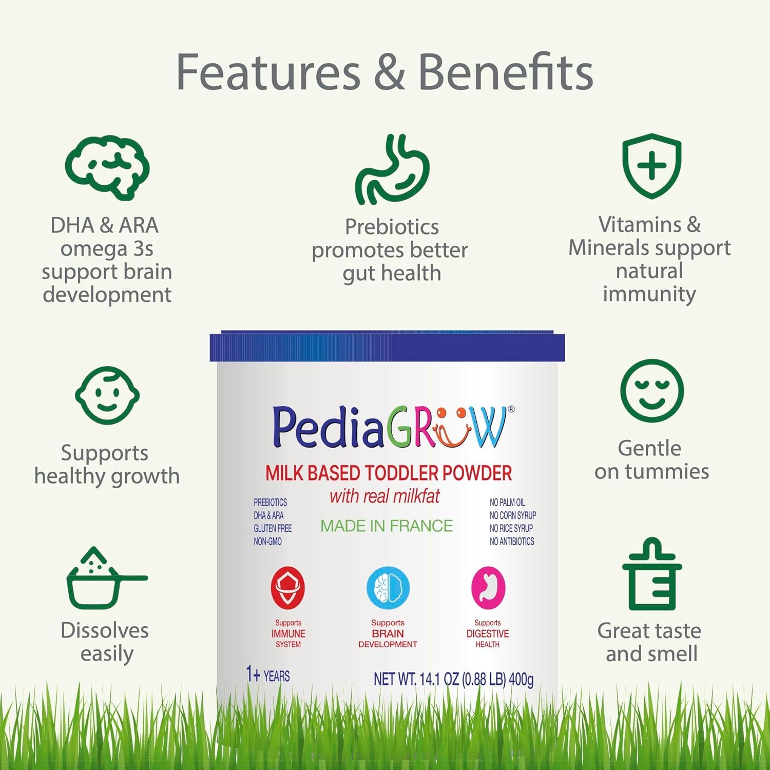 Pediagrow Toddler Nutritional Milk Powder Give Your Little One The Best Start With Pediagrow, The French-Made Milk Powder For Toddlers 12 Months And Older. Our Grass-Fed Milk Comes From Family-Owned Farms Where Cows Graze Freely On Nutrient-Rich Pastures. Pediagrow Is Specially Formulated To Support Healthy Growth, Brain Development, And A Strong Immune System, Making It Perfect For Weaning And Picky Eaters. Key Features: High Dha & Ara: Essential Fatty Acids For Brain Development. Fortified With Iron: Vital For Cognitive Development And Overall Health. Natural Prebiotics: Promotes Better Gut Health And Digestion. Gluten-Free & Non-Gmo: Safe For Sensitive Diets. No Unwanted Additives: No Antibiotics, Corn Syrup, Rice Syrup, Or Palm Oil. Benefits: Supports Natural Immunity Encourages Healthy Growth Promotes Brain Development Gentle On Tummies Our Creamy, Delicious Formula Dissolves Easily In Warm Water, Offering A Taste And Texture Even The Pickiest Eaters Will Enjoy. Give Your Child The Gift Of Nutritious, High-Quality Milk With Pediagrow. Perfect For Supporting Their Journey Of Growth And Discovery!