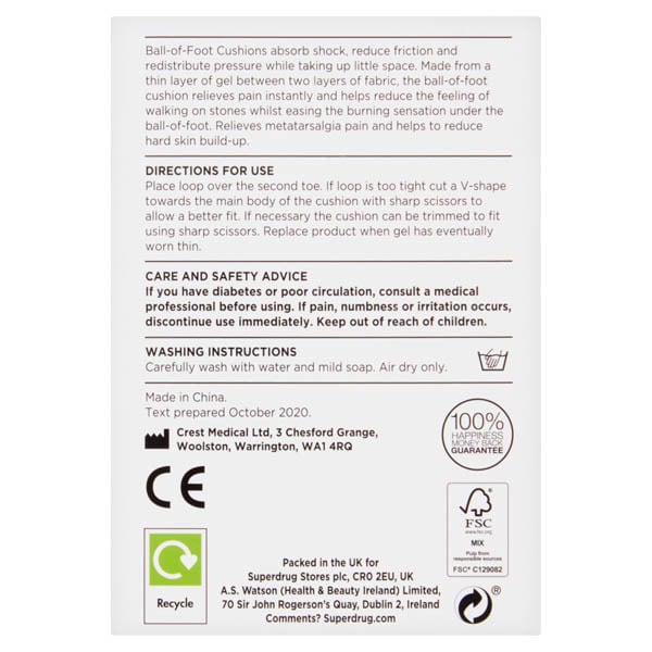 Product Information:Gel Ball Of Foot Cushions Absorb Shock, Reduce Friction And Redistribute Pressure With Each Step While Taking Up Little Space In The Shoe,Features:Gel Ball Of Foot Cushions Absorb Shock, Reduce Friction And Redistribute Pressure With Each Step While Taking Up Little Space In The Shoe,Product Specification:Product Code: 786252,Product Uses:Place Loop Over The Second Toe. If Loop Is Too Tight, Cut A V Shape Towards The Main Body Of The Cushion With Sharp Scissors As Shown In The Diagram To Allow A Better Fit