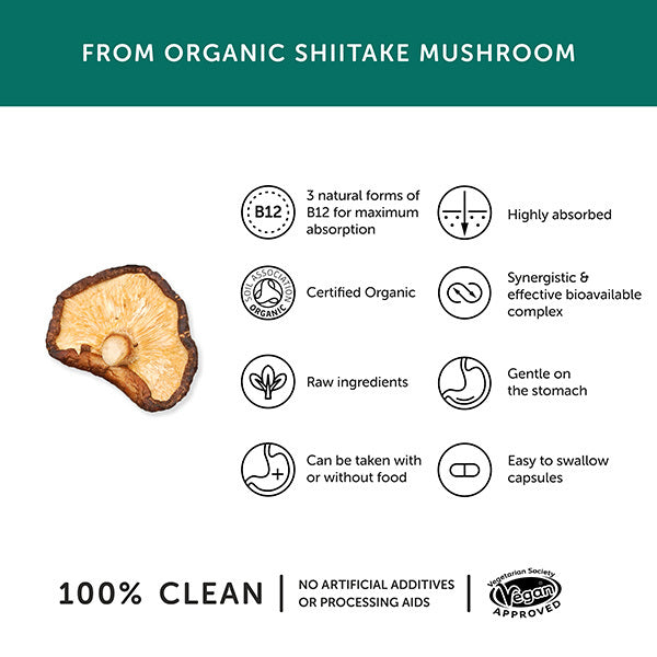 Key Highlights: • 3 Natural Forms Of B12 • Optimum Dose 20Mcg Of Vitamin B12 • A Complete Source Of B12 In Food Form • Soil Association Organic Certified • Highly Absorbed • Never Any Artificial Additives Or Processing Aids • Made With Simple Chemical-Free Processes • Easy To Take • Plastic-Free & Compostable Packaging • Certified Vegan & Cruelty-Free • Gentle On The Stomach Vitamin B12. The Organic And Natural Way. This Essential Supplement Is Made From Organic Shiitake & Oyster Mushrooms, Brimming With 3 Natural Forms Of Vitamin B12. It’S Sourced From Whole Foods, So Is More Easily Digested And Absorbed By The Body Than Standard Isolated Supplement Forms. Plus, It Benefits From Many Cofactors Such As Polysaccharides, Folate, Selenium And Iodine. A Key Nutrient It’S Only Required In Tiny Amounts, But Vitamin B12 Actually Plays An Essential Role In Our Wellbeing. Low Intake Can Lead To A Loss Of Energy, Anaemia And Damage To The Nervous System. As It Is Only Found In Animal Products Or Fortified Foods, B12 Is Difficult For Vegans To Get In Their Diets - And This Is Why Supplementing Is Particularly Important
