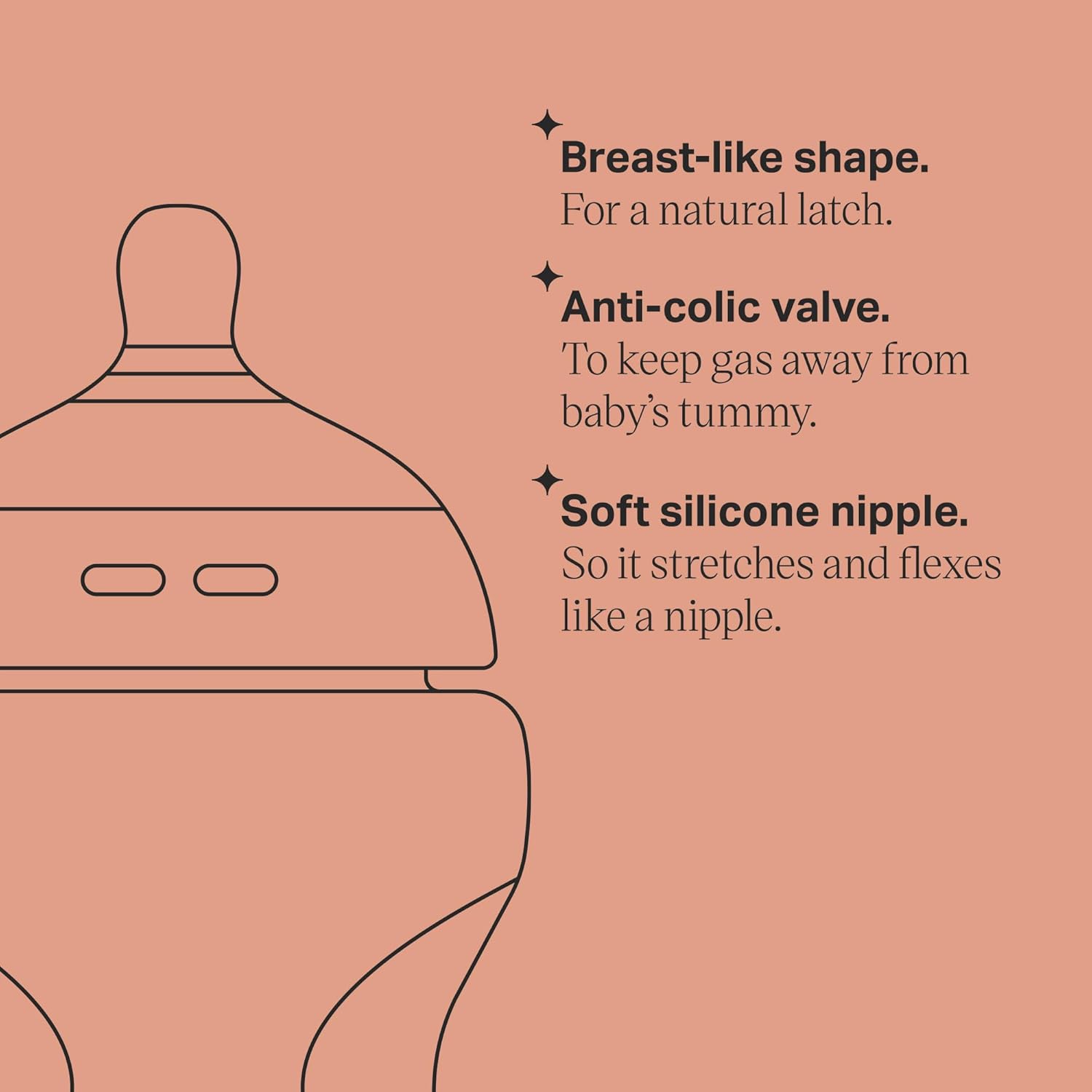 With our award-winning** Closer to Nature baby bottle, switching between breast and bottle feeding has never been simpler. With our breast-like nipple and built-in anti-colic valve, it could just be the best thing for baby, since you! Inspired by mom, designed by experts.Loved by moms and babies, our easy latch-on, breast-like nipple feels closer to skin and mimics the natural flex and movement of a mom's breast for a comfortable feed. 95% of moms reported that their baby accepted the super soft silicone nipple with skin-like feel and would recommend to others. *All Closer to Nature bottle nipples feature an anti-colic valve to prevent the symptoms of colic by ensuring your little one ingests more milk and less air. Together with the bottle’s sensitive valve, the wide bottle neck encourages your baby’s intuitive feeding action. Designed to be held in the most natural position during feeding, the compact shape of the bottle also allows baby to be closer to you.Tommee Tippee Closer to Nature baby bottles are available in a wide range of sizes, colors and decorations. Nipples are available in a range of flow rates too, so the milk can flow faster as your baby gets hungrier!The wide neck bottle makes cleaning easy, and the bottles are suitable for use in the dishwasher, microwave and steam sterilisers. 100% BPA-free for complete peace of mind. Which flow rate do I needWe offer different flow rates to keep up with your growing baby. Every baby is different but as a guide we suggest slow flow for 0+ months, medium flow for 3+ months and fast flow for 6+ months. Closer to Nature nipples are only compatible with Closer to Nature bottles.How often should I replace the bottle nipplesWe recommend changing your bottle nipples every two months and you should change them immediately if they're damaged or weak.*Based on 2021 study of 524 parents who use Tommee Tippee bottles** Made for moms March 2020,The original breast-like bottle: Shaped like a breast because babies prefer it that way, our award-winning Closer to Nature baby bottle could just be the best thing for baby, since you!,Breast-like: Our soft silicone, breast-like nipple feels closer to skin and flexes like mom for a comfortable feed and supports in the transition from breastfeeding to bottle feeding,Anti-colic: Sensitive Closer to Nature nipple with anti-colic valve reduces excessive air flow, so little ones ingest more milk and less air, preventing symptoms of colic,A latch made in heaven: 95% of moms say baby accepted our nipple* – the most easily accepted and breast-like nipple, ever, to encourage a natural latch,Mom recommended: 95% of moms would recommend Tommee Tippee Closer to Nature bottles to others