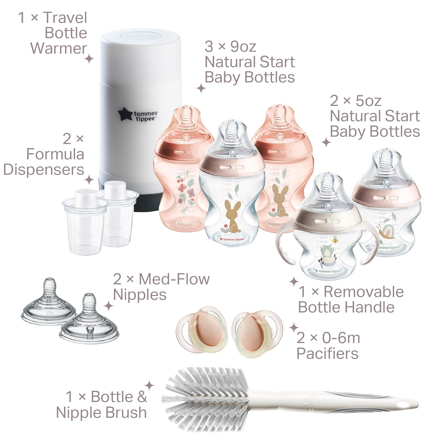 Tommee Tippee Natural Start 14 Piece Baby Bottle, Travel Bottle Warmer & Pacifier Set, 5 Bpa Free Bottles, 0+ Months, 2 Newborn Pacifiers, 2 Extra Nipples, 2 Formula Dispensers, Bottle Brush, Pink