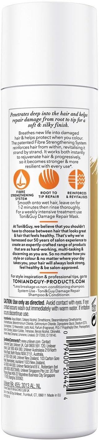 About this item ENHANCE SHINE: Toni&Guy Cleanse Shampoo for Damaged Hair revitalises, helps repair damage and enhances shine. Provides intense nourishment for weak, damaged hair even helps prevent breakage and dullness. INTENSELY NOURISH: Intensely nourishes to give damaged hair the attention it needs. Damaged hair needs intense nourishment and repair. Start with hair that's gently cleansed and nourished, no matter which style you go for. FOR WEAK & DAMAGED HAIR: Toni&Guy Cleanse Shampoo and Conditioner for Damaged Hair for weak, damaged hair that needs special attention. Give your hair a break from the hairdryer and hair straighteners for some well-deserved time off. STRONGER & HEALTHIER HAIR: Advanced formula penetrates the hair fibre for stronger, healthier hair and helps prevent against split ends. Leaves hair soft and healthy-looking. Start with hair that's gently cleansed and nourished, no matter which style you go for. › See more product details,ENHANCE SHINE: Toni&Guy Cleanse Shampoo for Damaged Hair revitalises, helps repair damage and enhances shine. Provides intense nourishment for weak, damaged hair even helps prevent breakage and dullness,INTENSELY NOURISH: Intensely nourishes to give damaged hair the attention it needs. Damaged hair needs intense nourishment and repair. Start with hair that's gently cleansed and nourished, no matter which style you go for,FOR WEAK & DAMAGED HAIR: Toni&Guy Cleanse Shampoo and Conditioner for Damaged Hair for weak, damaged hair that needs special attention. Give your hair a break from the hairdryer and hair straighteners for some well-deserved time off,STRONGER & HEALTHIER HAIR: Advanced formula penetrates the hair fibre for stronger, healthier hair and helps prevent against split ends. Leaves hair soft and healthy-looking. Start with hair that's gently cleansed and nourished, no matter which style you go for