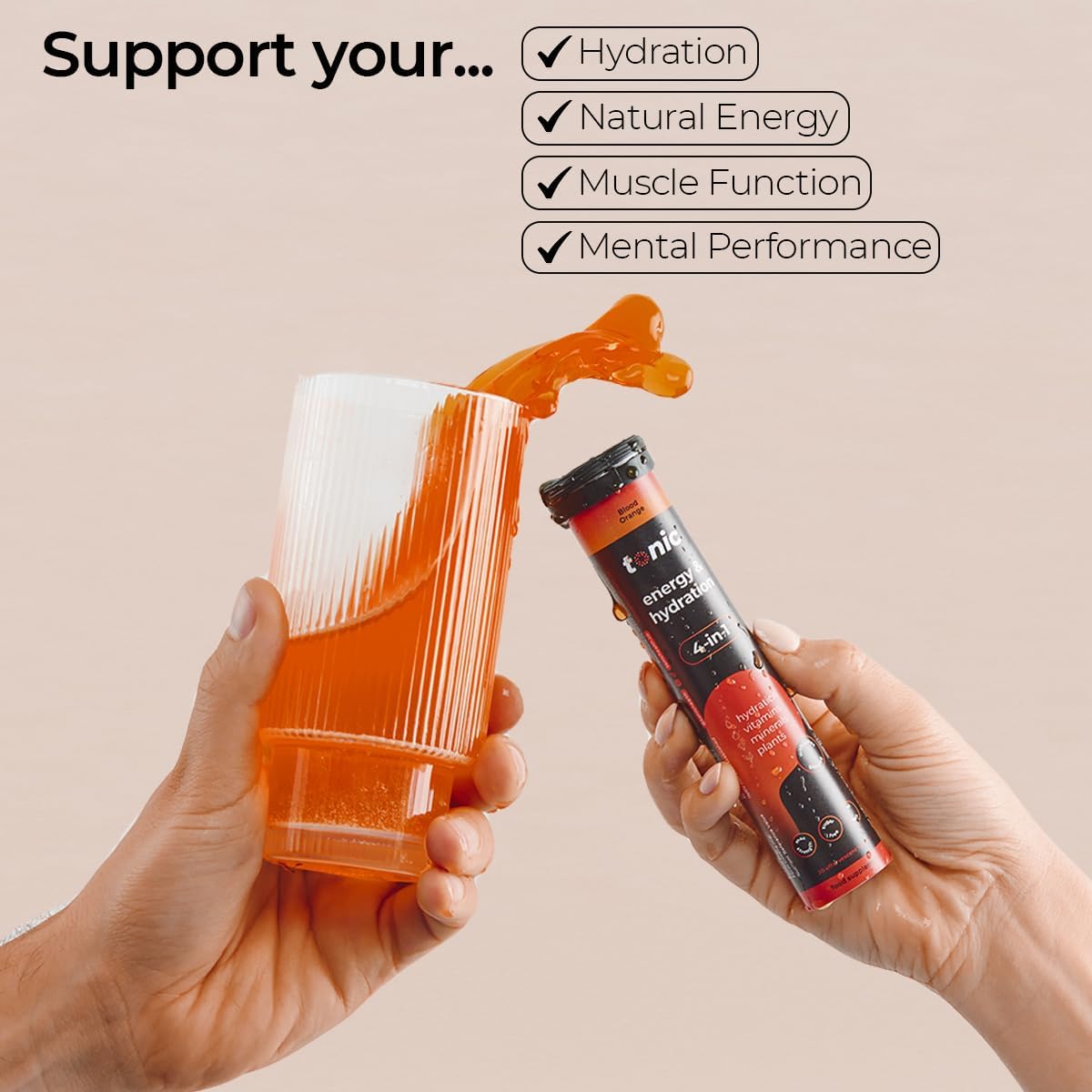 Tonic Health Energy And Hydration Tablets - 15 Vitamins, Minerals, Plants With Panax Ginseng, No Sugar Effervescent Multivitamins - Rehydration Electrolytes Tablets, Blood Orange 60 Count