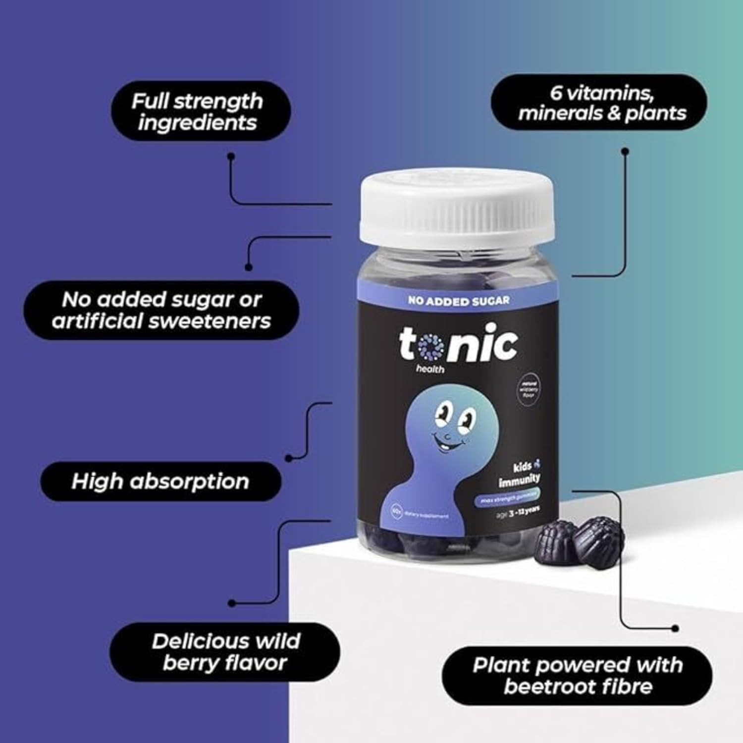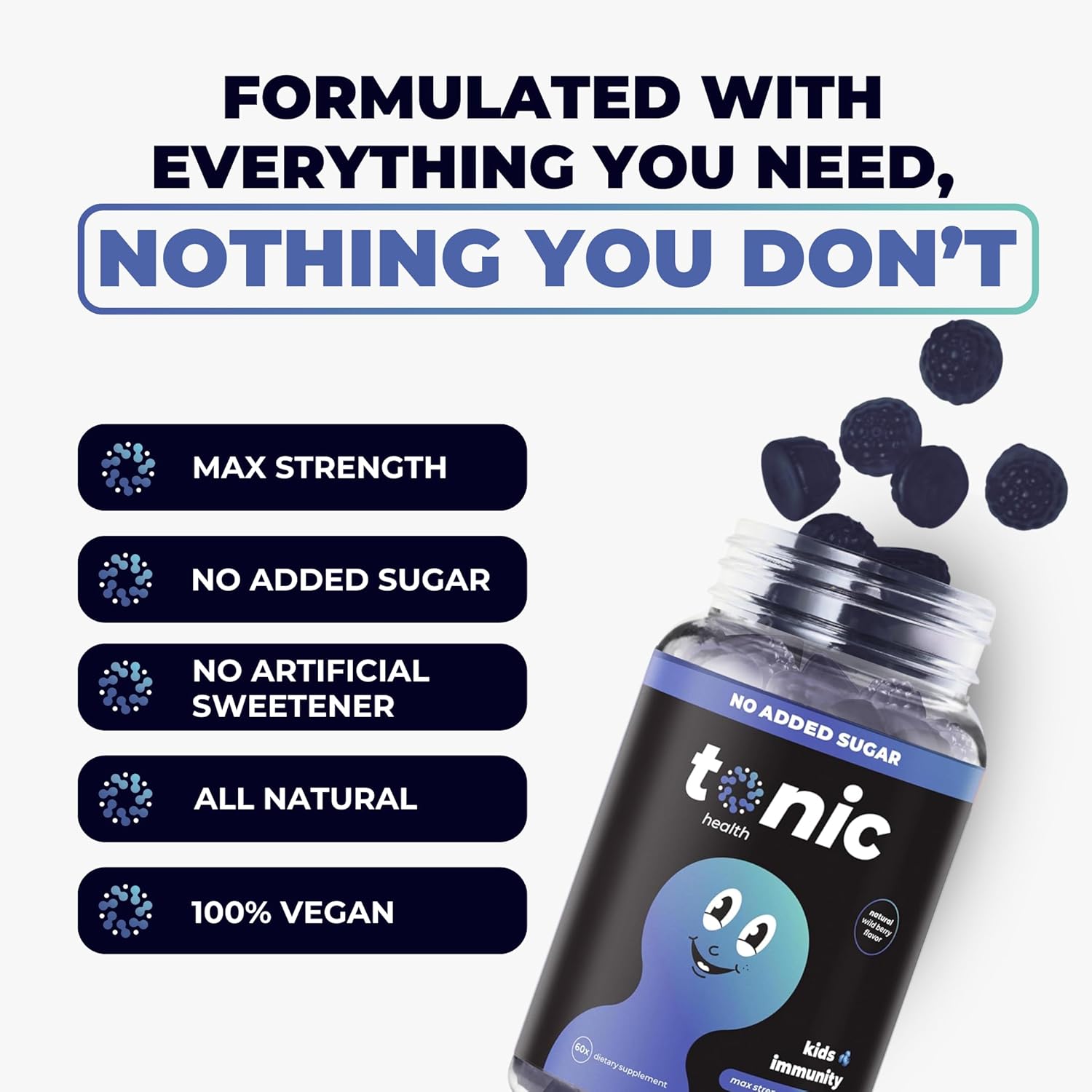 Tonic Health Kids Immunity Gummies - 7 In 1, Elderberry Gummies, No Added Sugar, No Sweeteners, Vitamins C, D And Zinc, Wild Berry Flavour, Month Supply (60 Count), Ages 3-12, Vegan