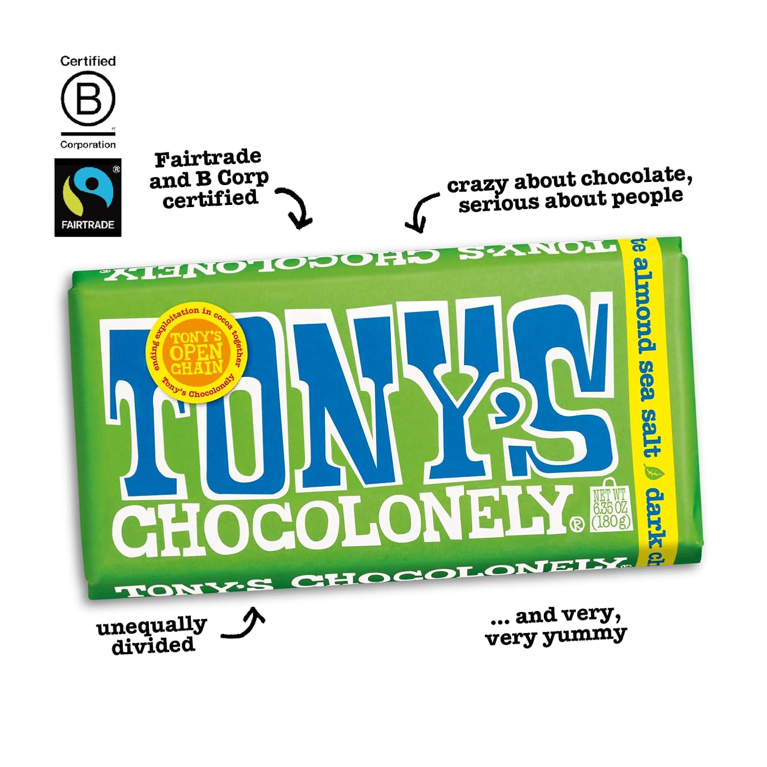 UNEQUALLY DIVIDED PIECES: Tony’s Chocolonely candy bars come with unequally divided pieces—on purpose! It’s our way of highlighting the inequality in the cocoa industry. While most bars are perfectly even, we think a little imperfection is a sweet reminder that fairness in cocoa production is still a work in progress. Enjoy a delicious snack with a purpose!