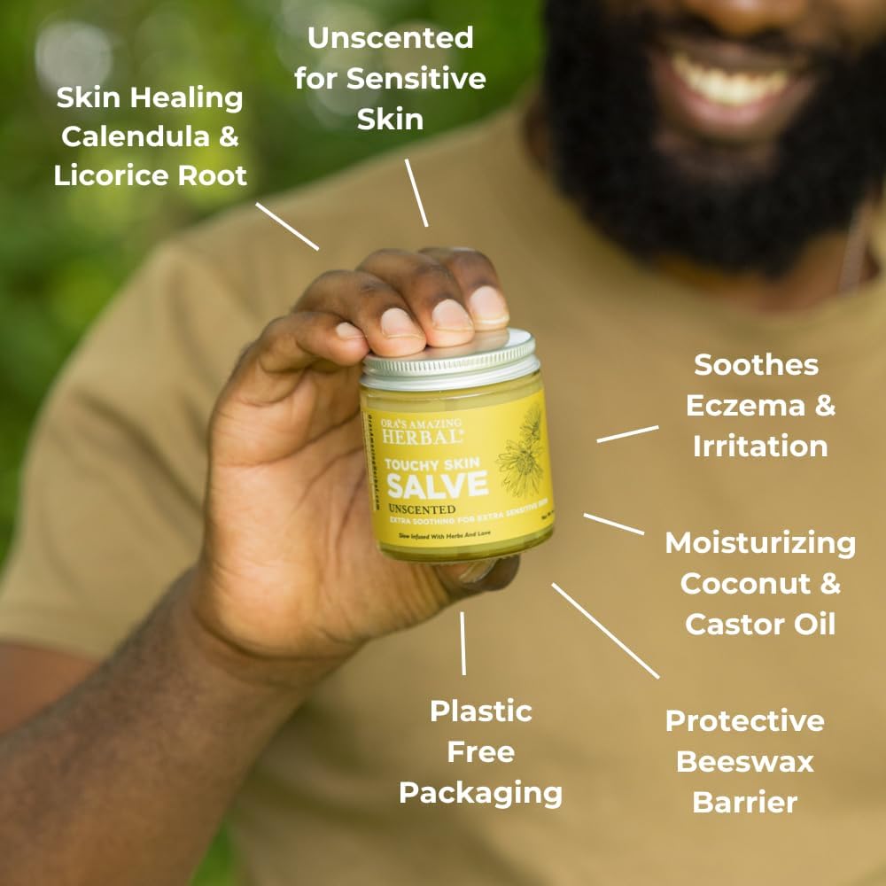 GENTLE RELIEF FOR SENSITIVE ECZEMA PRONE SKIN: Ora’s Amazing Herbal Touchy Skin Salve, is a clinically tested natural eczema cream and moisturizer for sensitive skin. We find it to be highly effective in soothing and healing affected areas as well as protecting the skin. It is one of our most popular products; paraben and steroid free eczema care ointment. Unscented & sting free