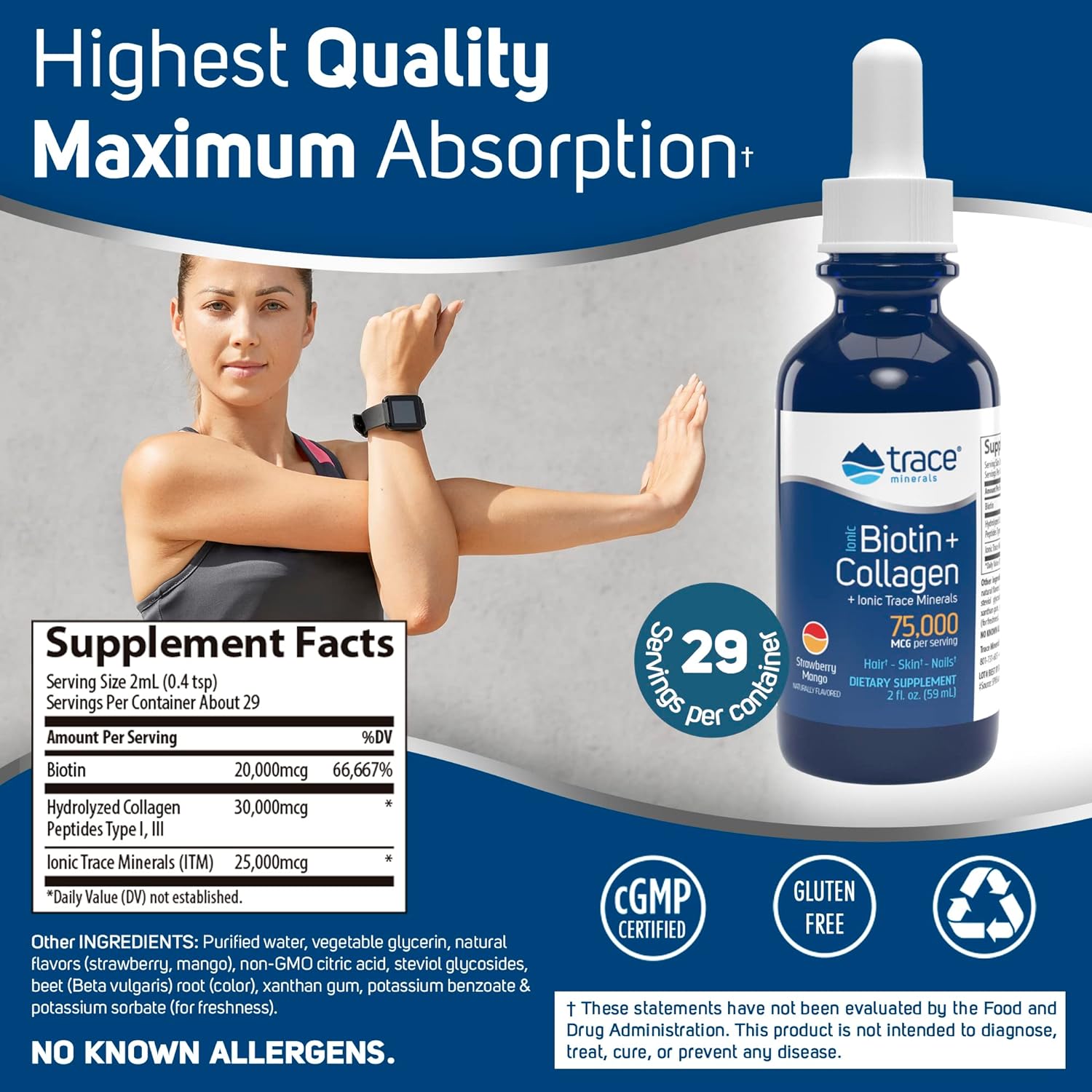 Trace Minerals | Liquid Ionic Biotin + Collagen (75,000Mcg) | Supports Hair, Skin & Nails | Strawberry Mango, Sugar Free | 29 Servings