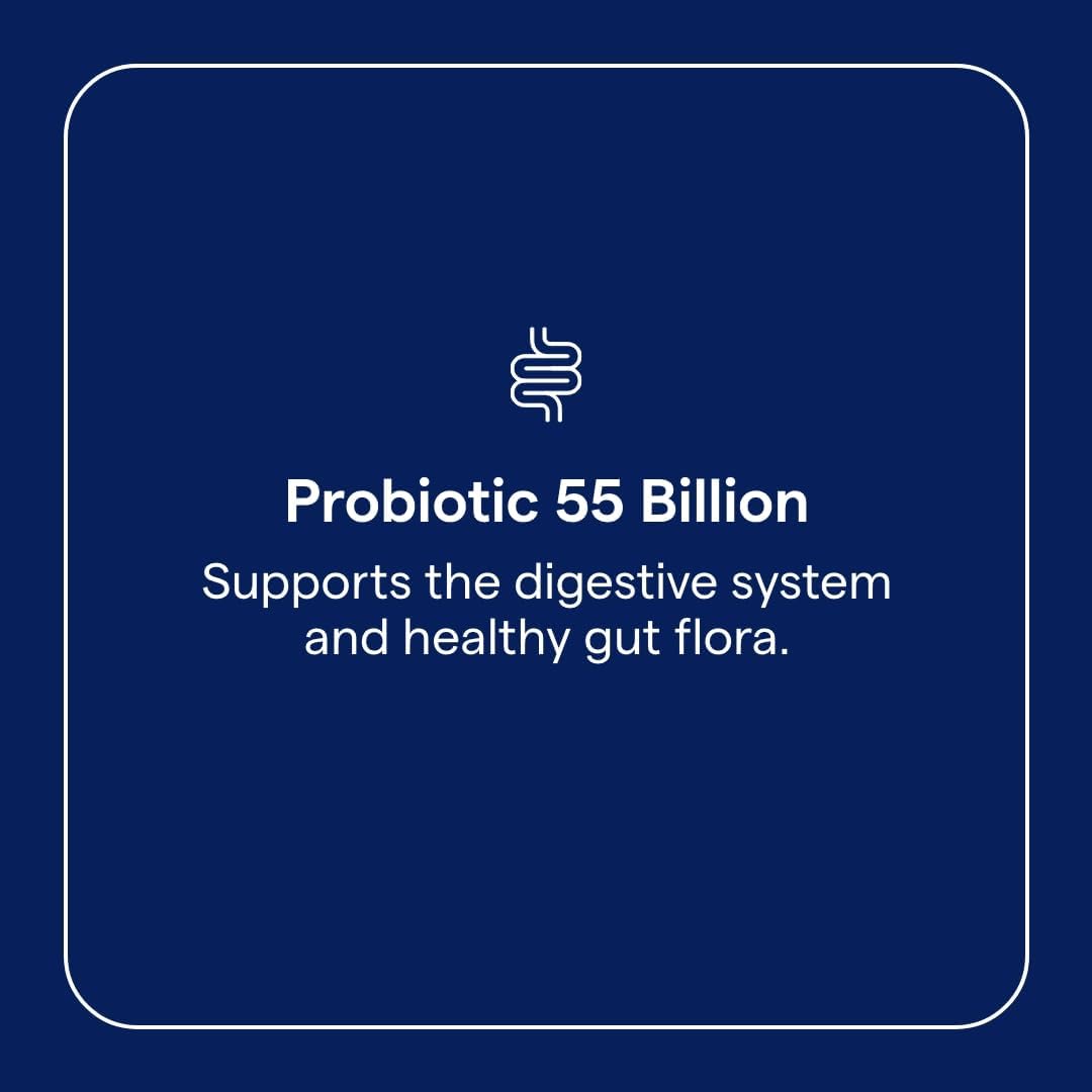 About this item Probiotic 55 billion Decreased intestinal flora can cause your digestive system to function incorrectly therefore, taking a probiotic like probiotic 55 billion daily can help your body maintain a healthy functioning digestive system In addition, each capsule is enteric-coated to help prevent probiotics from being damaged by stomach acid, allowing them to reach the small intestine for maximum effectiveness › See more product details,Probiotic 55 billion,Decreased intestinal flora can cause your digestive system to function incorrectly therefore, taking a probiotic like probiotic 55 billion daily can help your body maintain a healthy functioning digestive system,In addition, each capsule is enteric-coated to help prevent probiotics from being damaged by stomach acid, allowing them to reach the small intestine for maximum effectiveness