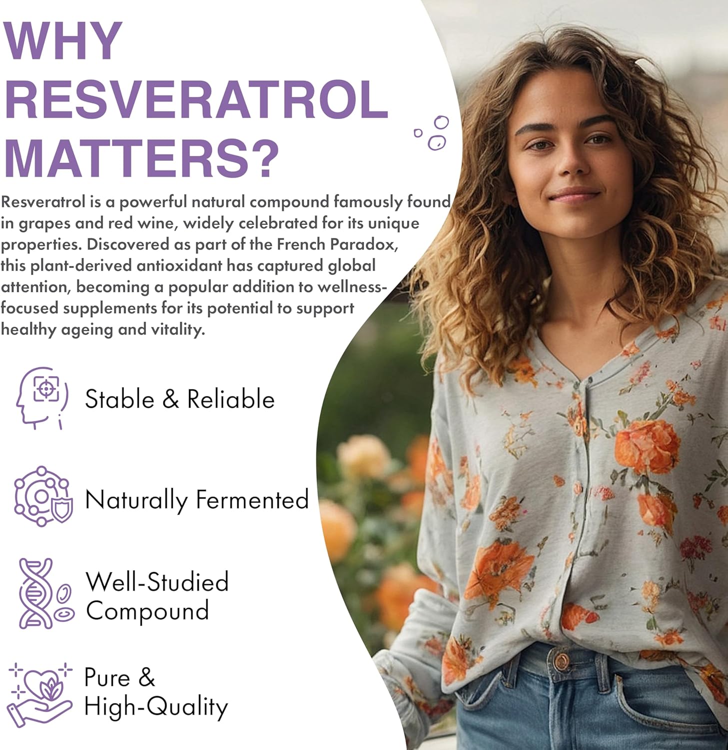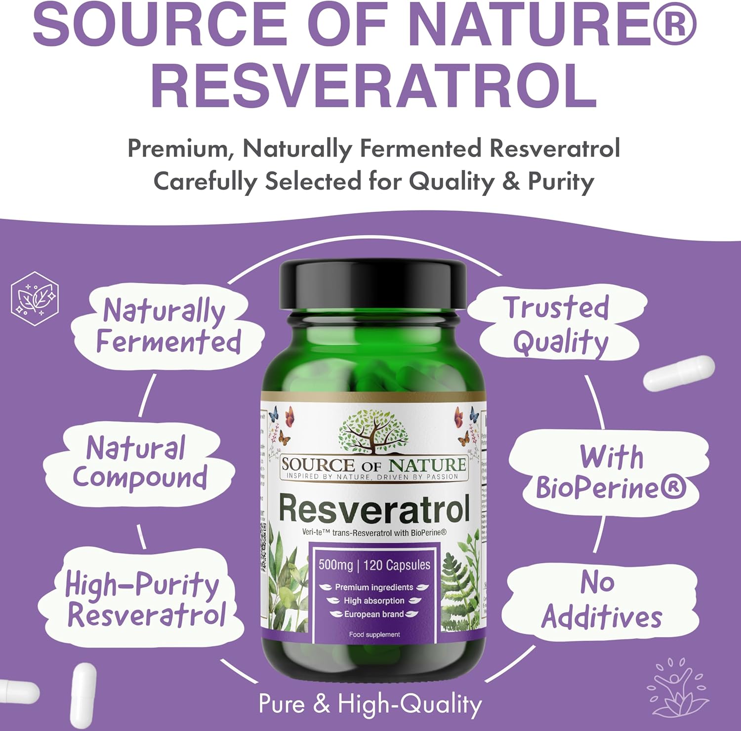 About this item ?? 500 mg Resveratrol per Capsule β 98% Trans-Resveratrol Highly concentrated and precisely dosed, no root extract used. ?? 90 Vegan Capsules β 3-Month Supply Just one capsule daily, long-lasting and economical. ?? Naturally Fermented β No Polygonum Source Clean, alternative sourcing with excellent purity. ? With 5 mg Piperine (Black Pepper Extract) Included for its common use in supporting bioavailability. ?? Independently Lab Tested For purity, potency, and identity β full transparency. ? Vegan, No Artificial Fillers or Additives No magnesium stearate or unnecessary excipients. ?? Premium Quality Formula Effective composition and clean sourcing for maximum trust. βΊ See more product details,?? 500 mg Resveratrol per Capsule β 98% Trans-Resveratrol Highly concentrated and precisely dosed, no root extract used,?? 90 Vegan Capsules β 3-Month Supply Just one capsule daily, long-lasting and economical,?? Naturally Fermented β No Polygonum Source Clean, alternative sourcing with excellent purity,? With 5 mg Piperine (Black Pepper Extract) Included for its common use in supporting bioavailability,?? Independently Lab Tested For purity, potency, and identity β full transparency,? Vegan, No Artificial Fillers or Additives No magnesium stearate or unnecessary excipients,?? Premium Quality Formula Effective composition and clean sourcing for maximum trust