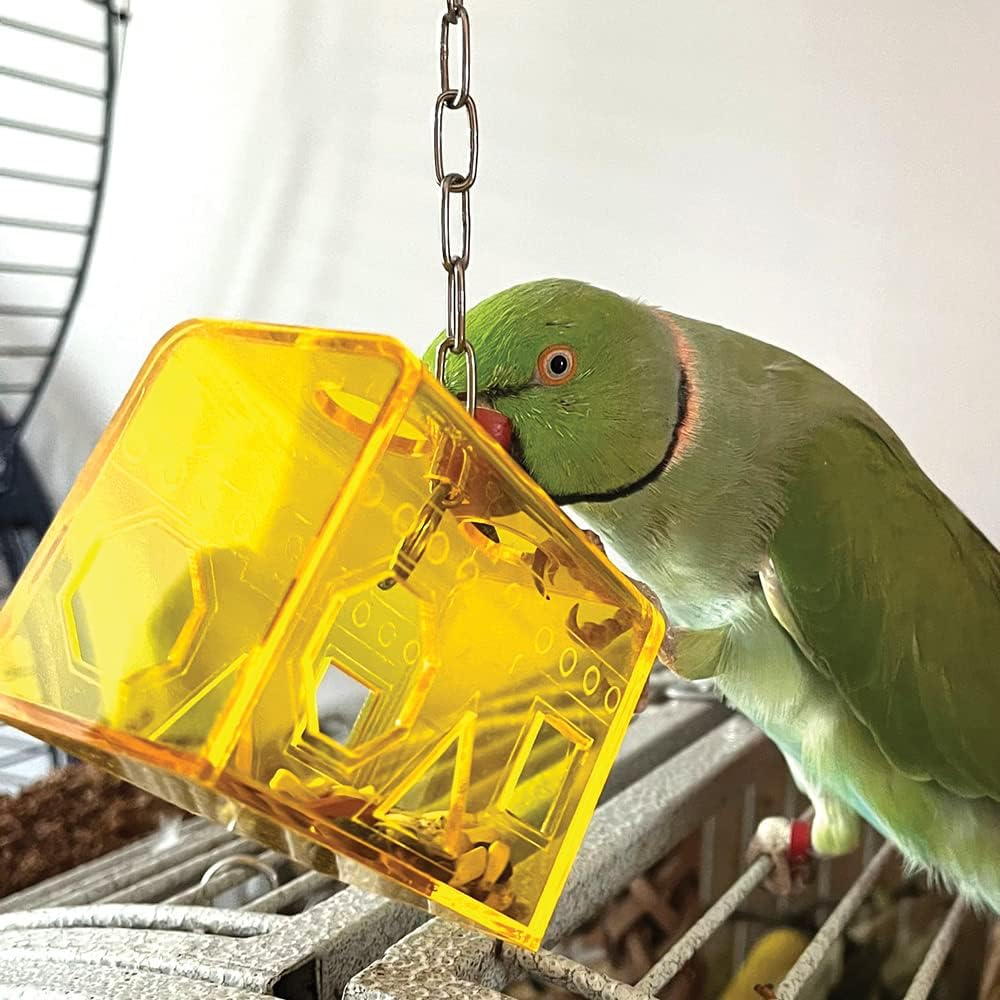 An acrylic treasure chest shaped box you can fill with wood shapes, treat or anything you can fit inside that your Parrot will happily want to retrieve. The see-through design of this Treasure Box Foraging Parrot Toy allows your Parrot to easily see the rewards inside. There various shaped holes around the toy allow access to the goodies inside but also make it challenging for them to be removed. Filling the Treasure Box with shredded paper allows you to hide smaller treats inside that might normally be too easily removed. There are lots of other ways you and your Parrot can enjoy using your Treasure Box Toy. You may even find that your Parrot starts storing their treasures inside this extra tough toy just to keep them safe! Dimensions - Toy Total Length with chain 18cm (7â€) Height of Box 6cm (2.3") Width of Box 8cm (3") Depth of Box 4.5cm (1.75") Materials - Treasure Box Acrylic, Metal. - African Grey Parrots - Amazon Parrots - Caiques - Eclectus Parrots - Large Conures - Meyer's and Senegal Parrots - Quakers also known as the Monk Parakeet - Small Conures - Small Macaws or Mini Macaws Please remember this information is for size guidance only - you know your bird best!