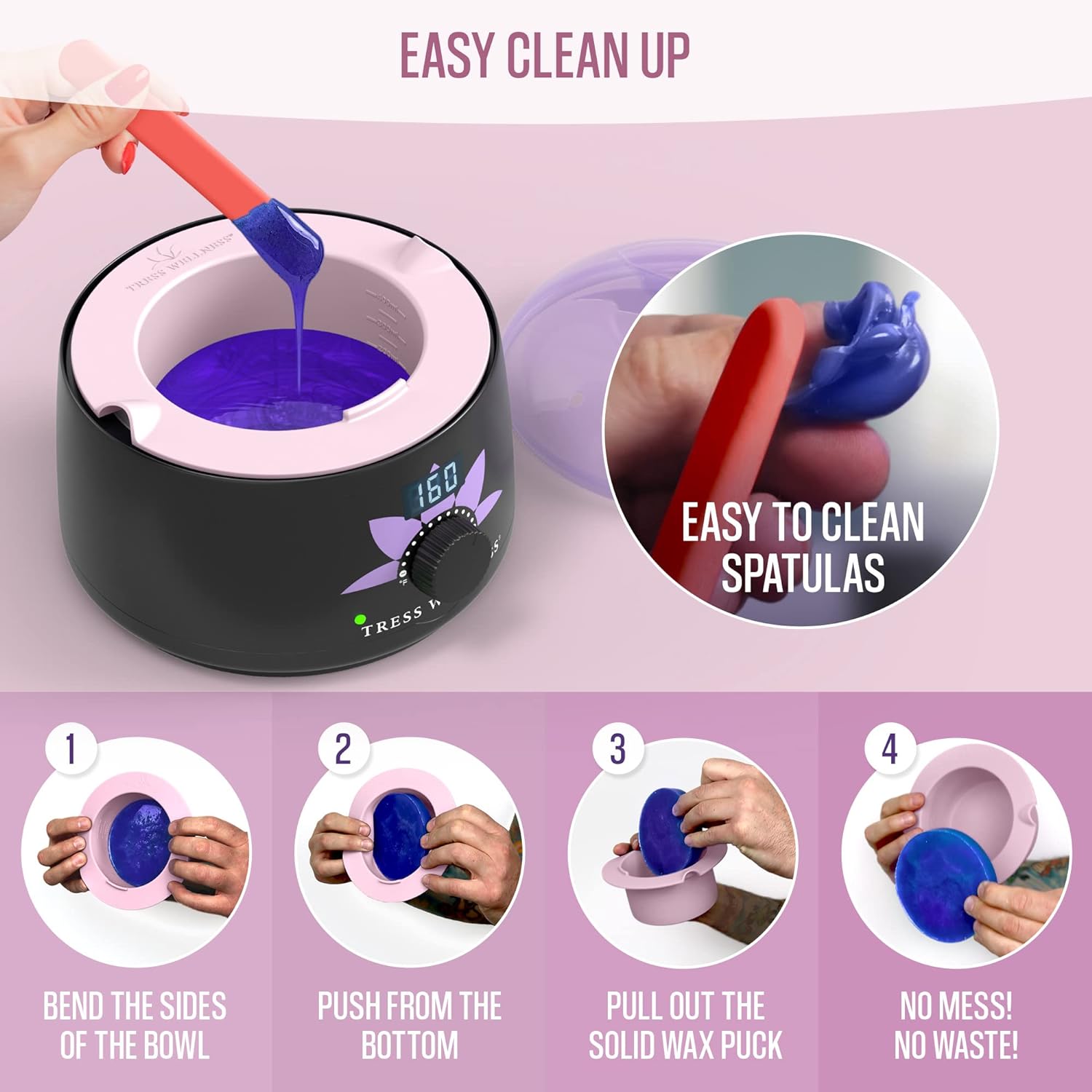 SUPER EASY CLEANING - Gone are the days of scraping sticky wax out of a metal tin, only for half of the wax to solidify in the Silicone Bowl. Simply allow the wax to harden in the silicone wax pot and bend the silicone to pop out the now hard wax disk, ready to be used in your next waxing sessionKIT INCLUDES - A flexible silicone wax melting bowl, 1 Large silicone application spatula, 1 Small silicone application spatula and an instruction guide. All of our silicone products are made from soft and heat resistant high-grade siliconeCOST EFFECTIVE & MONEY SAVING - No more wasted wax going in the bin, both the silicone wax warmer liner and the waxing sticks for hard wax allow you to easily remove and store unused wax for future useMELTING BOWL FEATURES - 2 useful finger loops for grabbing whilst hot. Interior measuring lines for A functional scraper for removing excess wax on the spatula and measuring lines inside. An anti-mess rim to capture dripping waxFITS MOST WAX WARMERS - Our wax warmer silicone liners are custom designed for a perfect fit inside the TRESS WELLNESS wax warmer, but our silicone heating bowl will fit inside most of the wax warmers available