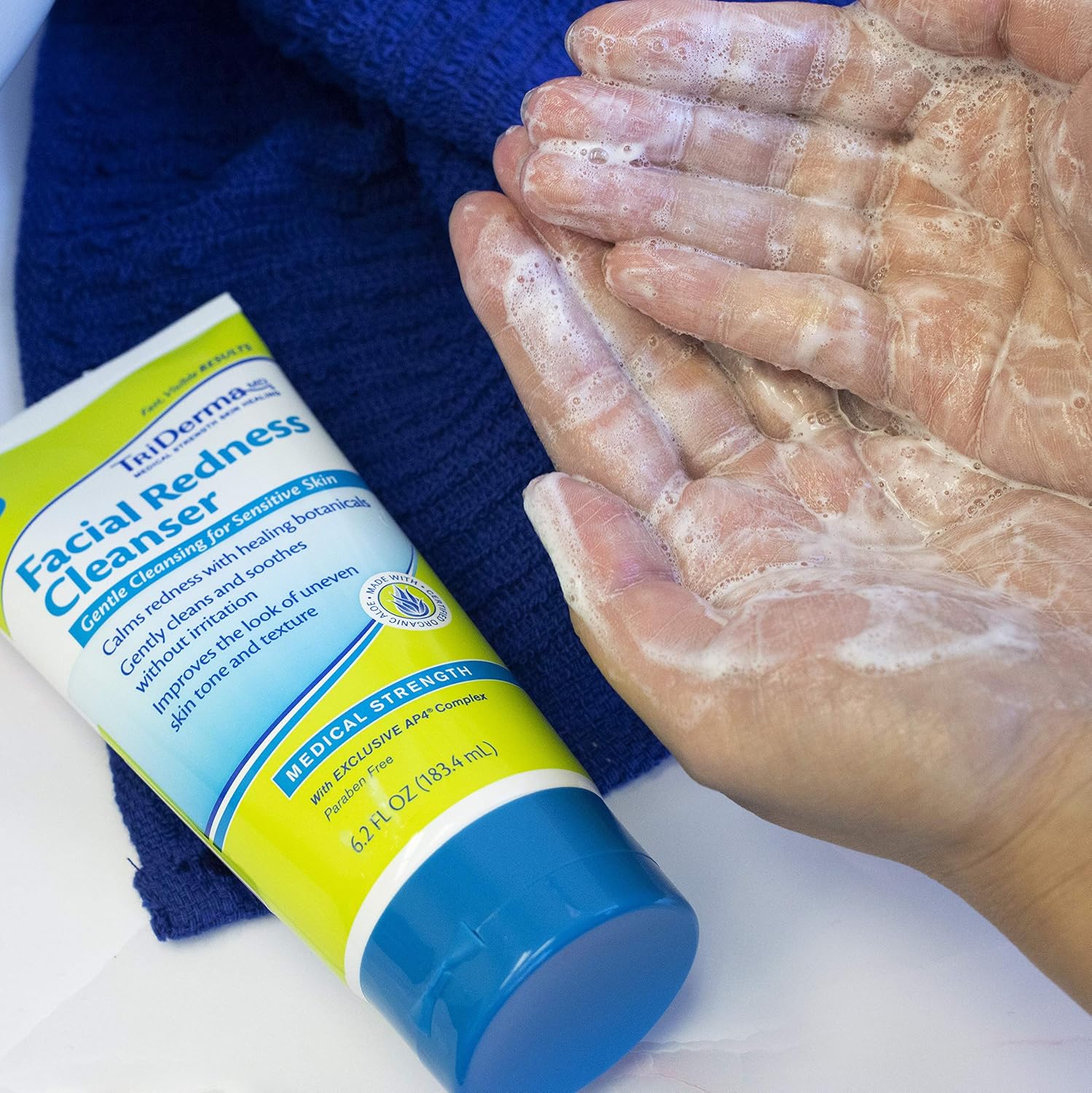 About this item Gently cleanse irritated skin, reduce the look of redness and help improve uneven skin tone with TriDerma's Facial Redness Cleanser! Specially formulated for the face and upper chest, this cleanser won't agitate your complexion and can be used on all skin types. This cream cleanser is formulated to be as gentle as possible while maintaining effectiveness. It will remove dirt and grime without stripping your skin of its natural moisture. It makes a great go-to for removing your makeup without causing more irritation. This product is easy to integrate into your daily beauty regimen, as it works well with other products, like serums and boosters. For maximum redness relief, use TriDerma's Facial Redness Relief cream immediately after. Always finish with SPF to protect your skin from harmful rays. Facial Redness Cleanser is designed to clean without causing additional irritation and is perfect for sensitive skin. Free from parabens, petrolatum and mineral oil. This cream cleanser is easy to use. Apply to wet skin and massage gently onto face and neck. Rinses off without leaving any residue. Use morning and night for best results. May show reduction in redness in as early as a week, but we recommend a month's trial. Safe for Sensitive Skin, this cream is free from fragrance, parabens, steroids, sulfates, mineral oil, phthalates. Made with our exclusive AP4 Aloe Vera Gel Complex, a proprietary formula that naturally contains 200+ healing properties. See more product details,Gently cleanse irritated skin, reduce the look of redness and help improve uneven skin tone with TriDerma's Facial Redness Cleanser! Specially formulated for the face and upper chest, this cleanser won't agitate your complexion and can be used on all skin types,This cream cleanser is formulated to be as gentle as possible while maintaining effectiveness. It will remove dirt and grime without stripping your skin of its natural moisture. It makes a great go-to for removing your makeup without causing more irritation,This product is easy to integrate into your daily beauty regimen, as it works well with other products, like serums and boosters. For maximum redness relief, use TriDerma's Facial Redness Relief cream immediately after. Always finish with SPF to protect your skin from harmful rays,Facial Redness Cleanser is designed to clean without causing additional irritation and is perfect for sensitive skin. Free from parabens, petrolatum and mineral oil,This cream cleanser is easy to use. Apply to wet skin and massage gently onto face and neck. Rinses off without leaving any residue. Use morning and night for best results. May show reduction in redness in as early as a week, but we recommend a month's trial,Safe for Sensitive Skin, this cream is free from fragrance, parabens, steroids, sulfates, mineral oil, phthalates. Made with our exclusive AP4 Aloe Vera Gel Complex, a proprietary formula that naturally contains 200+ healing properties