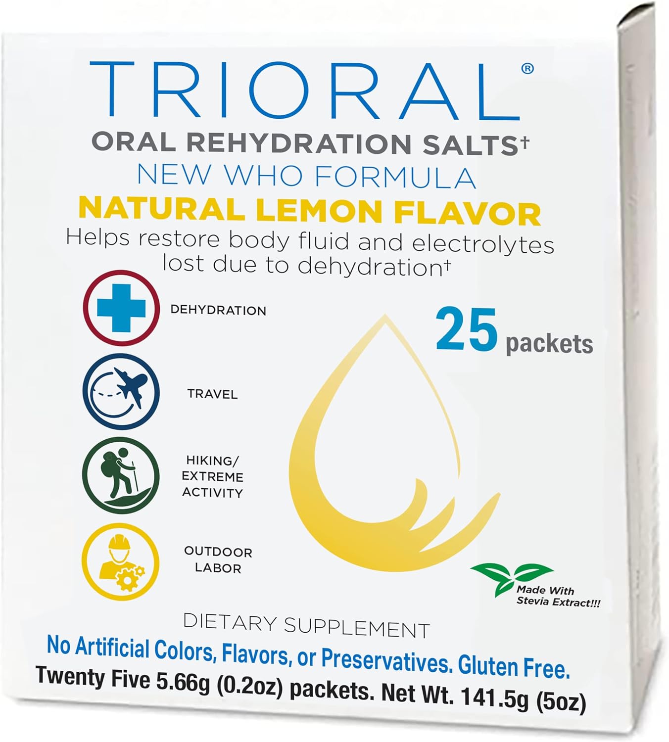 Trioral Natural Lemon W/Stevia Oral Rehydration Salts - Who Hydration Supplement Salts Formula - Combat Dehydration From Workouts, Fluid Loss And Much More (25 Packets/Box)