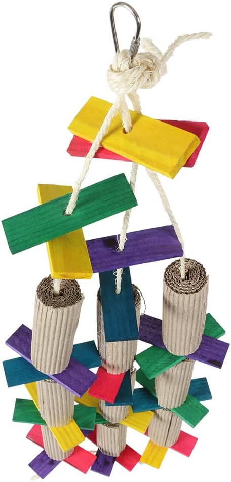 Three times the shredding and chewing fun. Let your beaky buddy enjoy this entertaining Triple Shredding Tower Parrot Toy. There is plenty to chew, rip and shred. You can push treats inside the ends of the corrugated cardboard rolls for your bird to retrieve, providing further mental stimulation. Each of the coloured wood slats can be chewed, helping your Parrot to keep their beak healthy and trim. Plus, there's knotted sisal rope for your Parrot to enjoy untying, picking to pieces and preening on. Use the pear link provided to quickly and securely fasten this Triple Shredding Tower Parrot Toy to your ParrotĆ¢ā¬s cage or play gym stand. Dimensions Length 58cm (22.75") Width 16cm (6.25") Materials Cardboard, Wood, Sisal, Metal, Glue