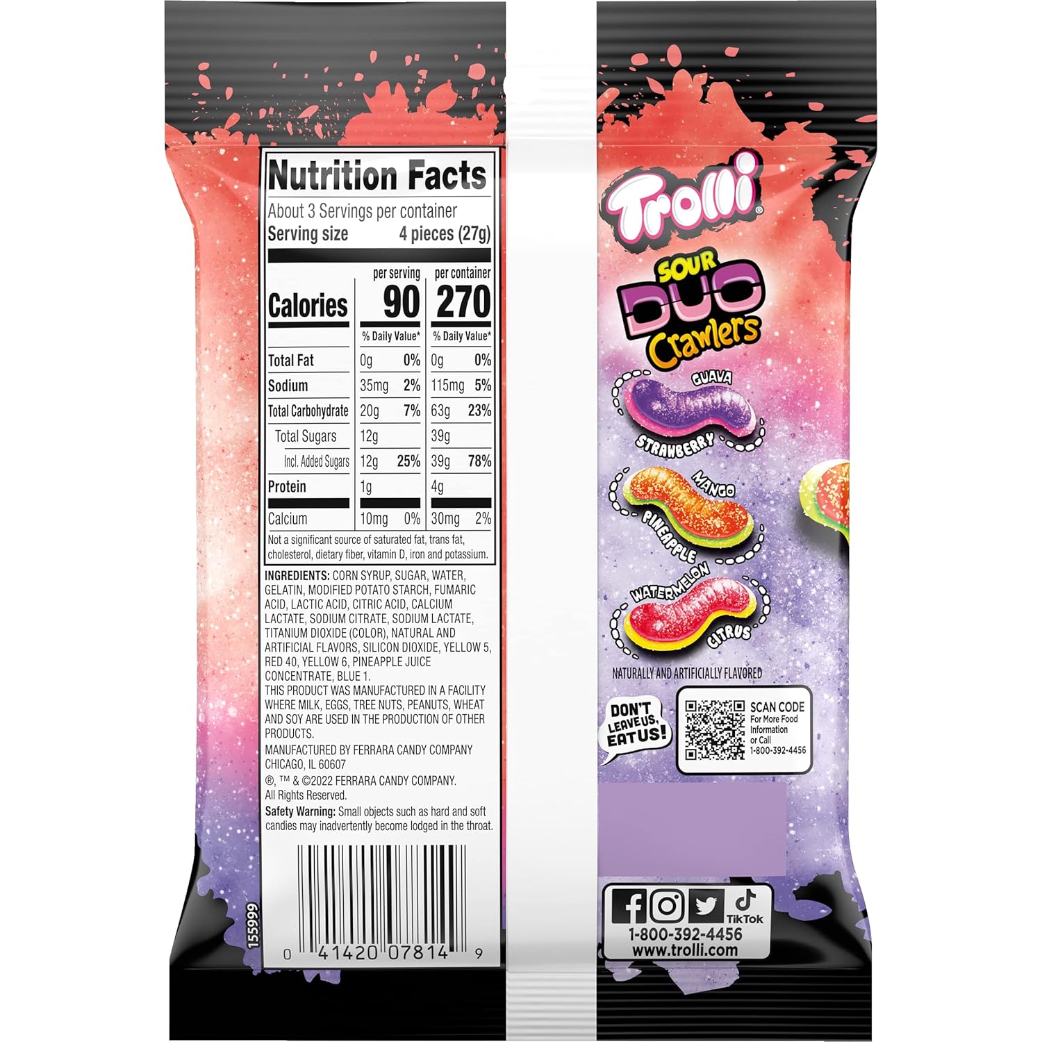 Prep Your Taste Buds Because TrolliāS Sour Duo Crawlers Bring A Much-Needed Sensory Thrill, Combining The Classic Chewy Gummy Texture On One Side, And A Soft And Squishy Texture On The Other Together For One Unexpected, Sour Taste! Available In Three New Sour Tropical Flavors, Including Mango Pineapple, Citrus Watermelon And Strawberry Guava, Devour The Duo And Experience TrolliāS Newest Sour Gummy Creation. Grab A Pack Of Sour Duo Crawlers At A Store Near You Now! Whether You'Re Looking For A Snack To Satisfy Your Sweet Tooth, Or You'Re In The Mood For Something Sour And Tangy, Trolli Sour Brite Duo Crawlers Are The Perfect Candy For You. With Their Bold Flavors, Soft Texture, And Colorful Design, They Are Sure To Be A Hit With Anyone Who Loves Sour Or Gummy Candies. So Why Wait