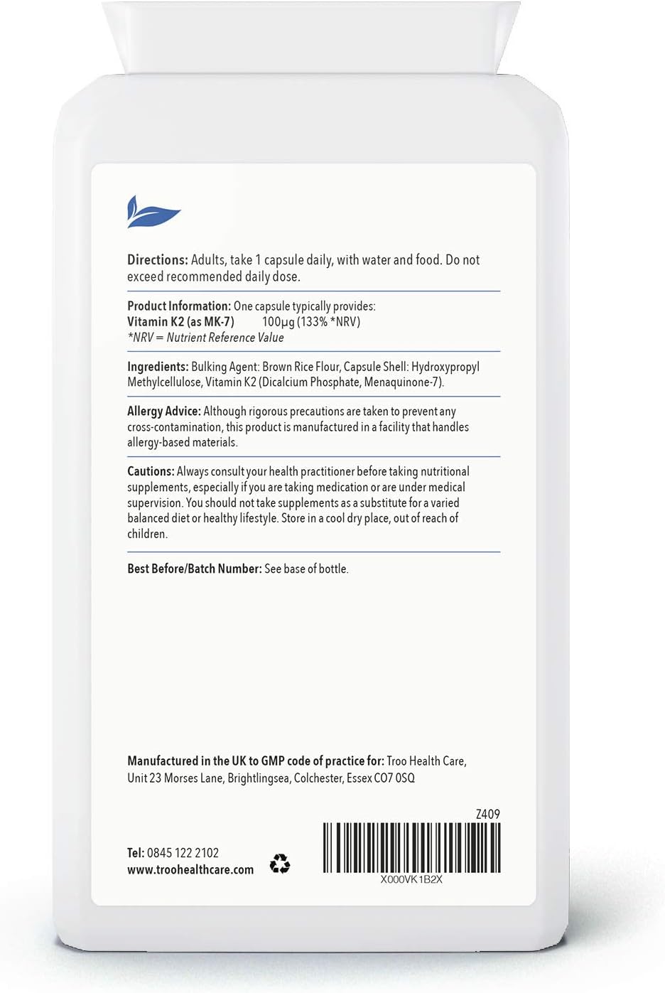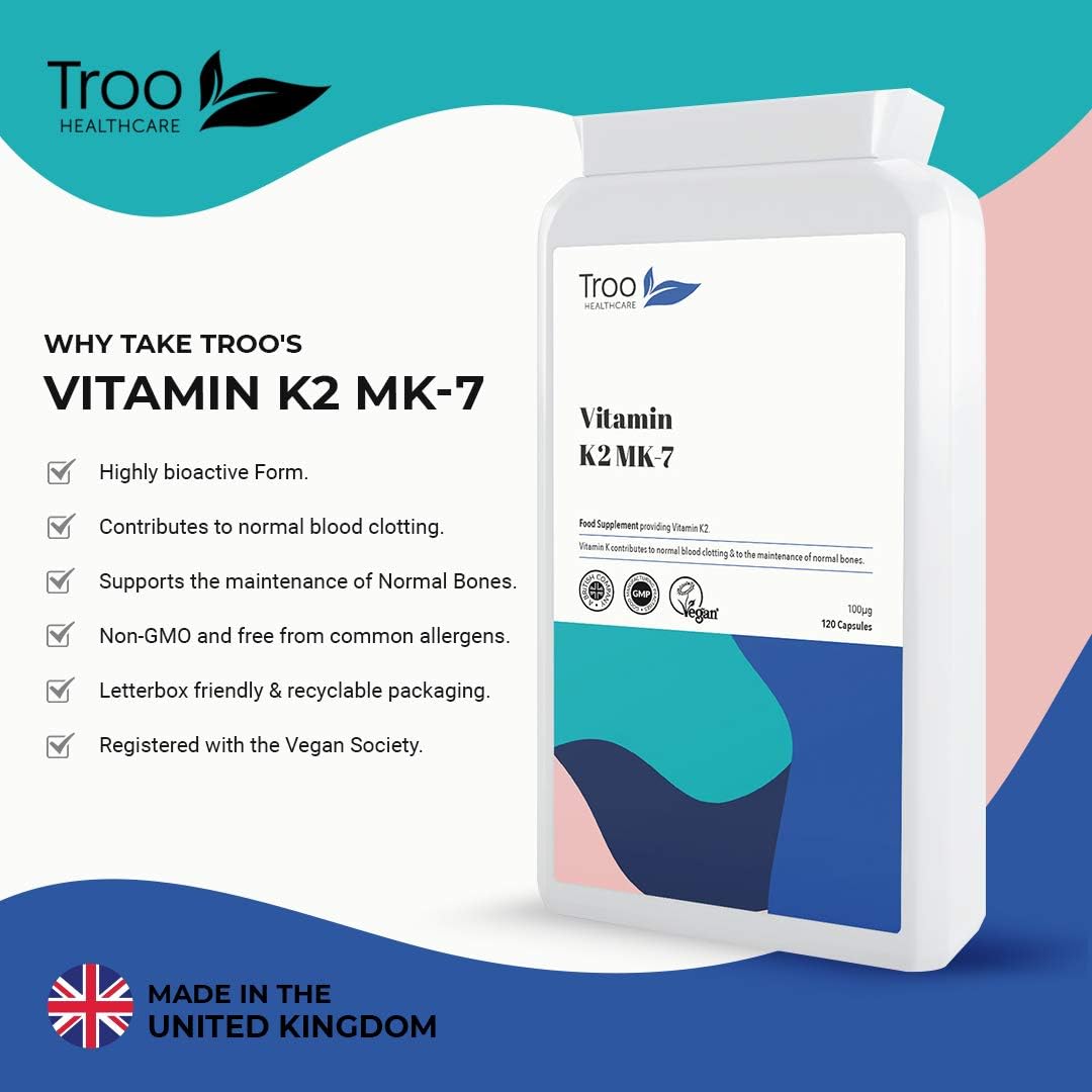 DESCRIPTION : Troo Vitamin K2 MK-7 100mcg 120 Capsules - Highly Bioactive Vit K2 Bone Support Supplement Using MK7 - Easy Swallow - Suitable for Vegans - 4 Month Supply
