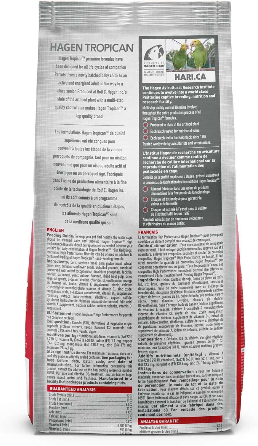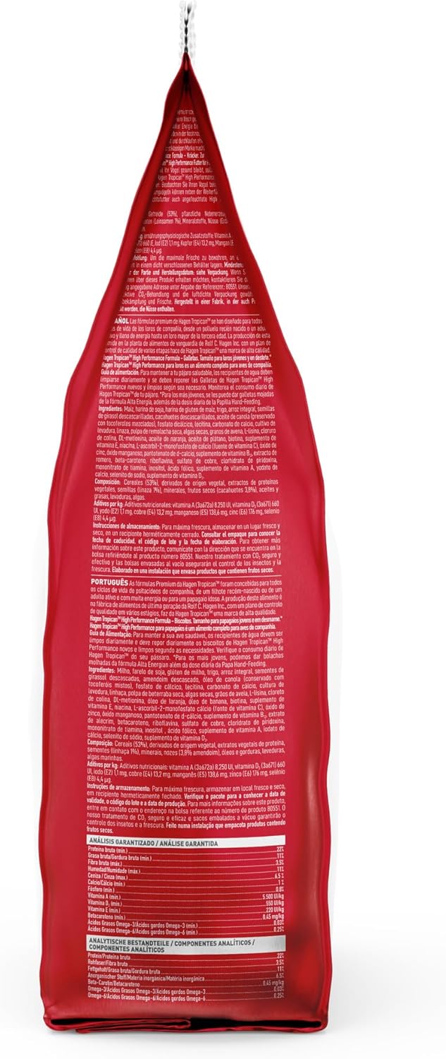 Product Description A High Performance diet meets the higher requirements for breeding (parental egg laying and rearing of young) and growing Parrots (hand-feeding from hatch). It’s an excellent peanut-derived source of fat and protein, as well as a source of essential grains that complement amino acid profiles; all critical for feather and muscle development. A rich source of Omega fatty acids from flaxseed, peanuts and sunflower seeds makes feathers shine and helps support a healthy body. Ingredients Corn, soybean meal, corn gluten meal, wheat, brown rice, dehulled sunflower seeds, dehulled peanuts, canola oil (preserved with mixed tocopherols), dicalcium phosphate, lecithin, calcium carbonate, yeast culture, flaxseed, dried beet pulp, dried kelp, oat groats, L-lysine, choline chloride, DL-methionine, orange oil, banana oil, biotin, vitamin E supplement, niacin, calcium L-ascorbyl-2-monophosphate (source of vitamin C), zinc oxide, manganous oxide, d-calcium pantothenate, vitamin B12 supplement, rosemary extract, beta-carotene, riboflavin, copper sulfate, pyridoxine hydrochloride, thiamine mononitrate, inositol, folic acid, vitamin A supplement, calcium iodate, sodium selenite, vitamin D3 supplement. P.when('A').execute(function(A) { A.on('a:expander:toggle_description:toggle:collapse', function(data) { window.scroll(0, data.expander.$expander[0].offsetTop-100); }); }); Directions For maximum freshness, once opened, store in a cool, dry place. Our safe and effective CO2 treatment and air barrier bags ensure insect control and freshness. Manufactured in a facility that packages products containing nuts. See more
