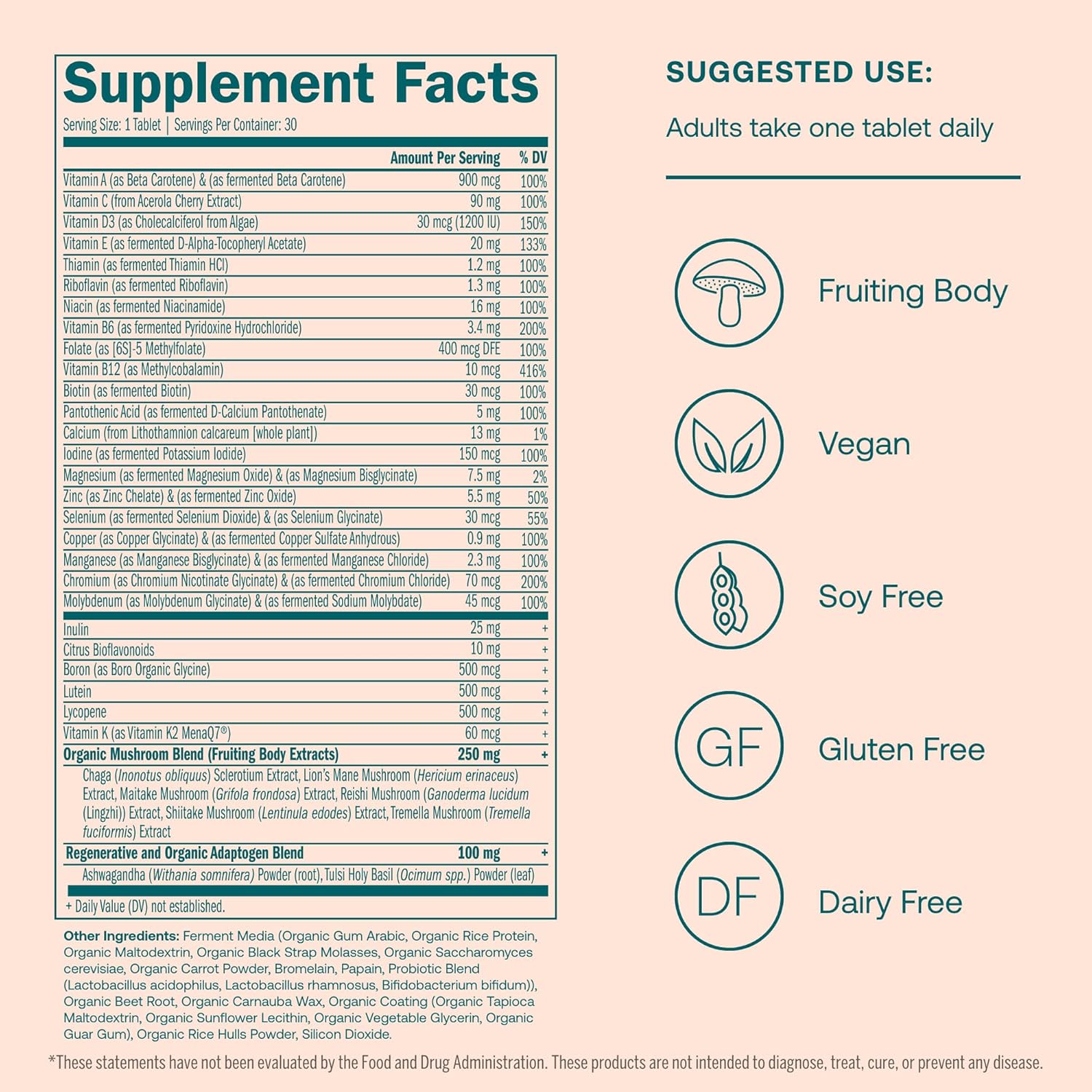 True Grace One Daily Women’S Multivitamin 40+ Fermented Minerals, Organic Adaptogens & Mushrooms Energy, Immune, Bone, Heart Support - Iron Free, Non-Gmo, Gluten Free, Soy Free - 30 Vegan Tablets