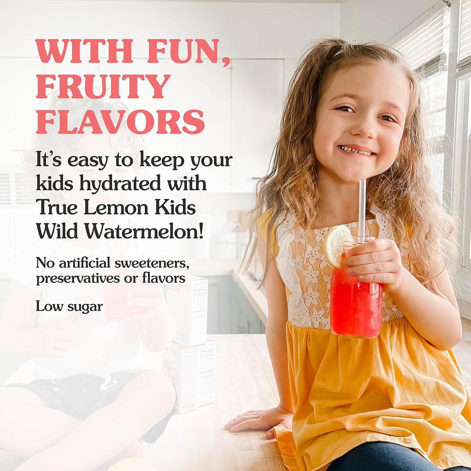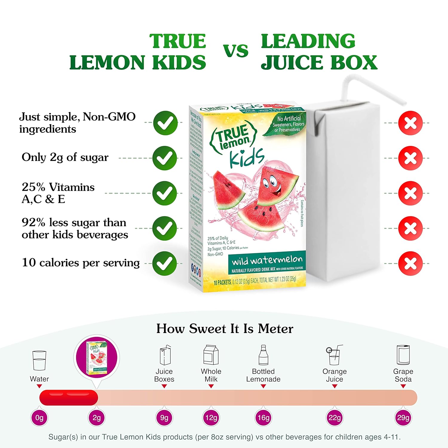 LOW SUGAR: True Lemon Kids Wild Watermelon is full of delicious flavor that kids love: yummy watermelon so this kids drink mix makes it easy to keep your children deliciously hydrated. And, with only 2 grams of sugar per serving, True Lemon Kids has 92% less sugar than leading children beverages like juice and soda!