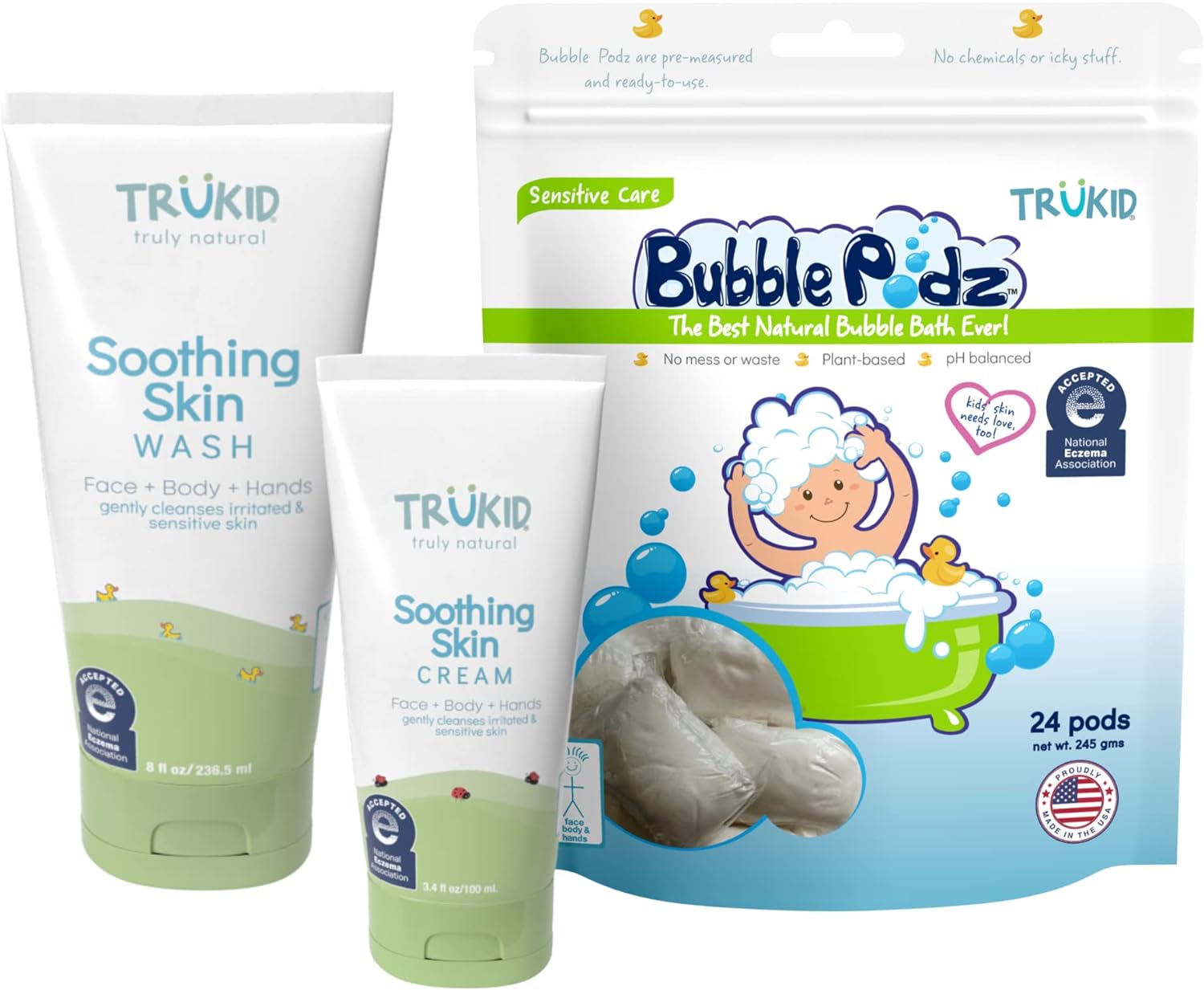TruKid NEA-Accepted Eczema Relief Bundle | Bubble Bath, Skin Cream, and Body Wash | All Natural Ingredients, Unscented, Hydrates, Moisturizes and Protects Irritated & Sensitive Skin | Three Products