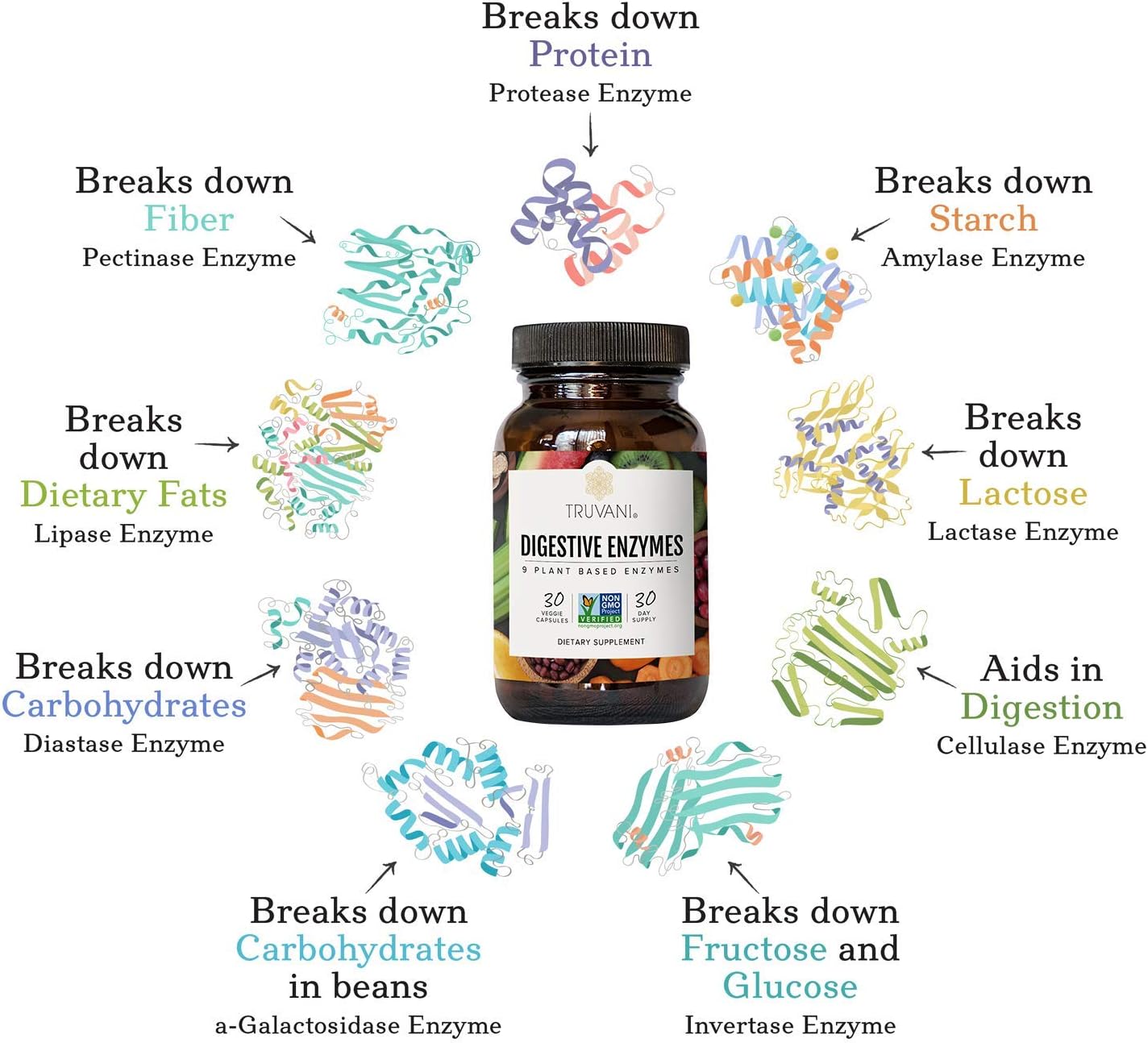 Truvani Digestive Enzymes | 9 Enzyme Blend | Digestive Support | Reduce Bloating | Increased Nutrient Absorption | Non-Gmo Capsules| 30 Day Supply