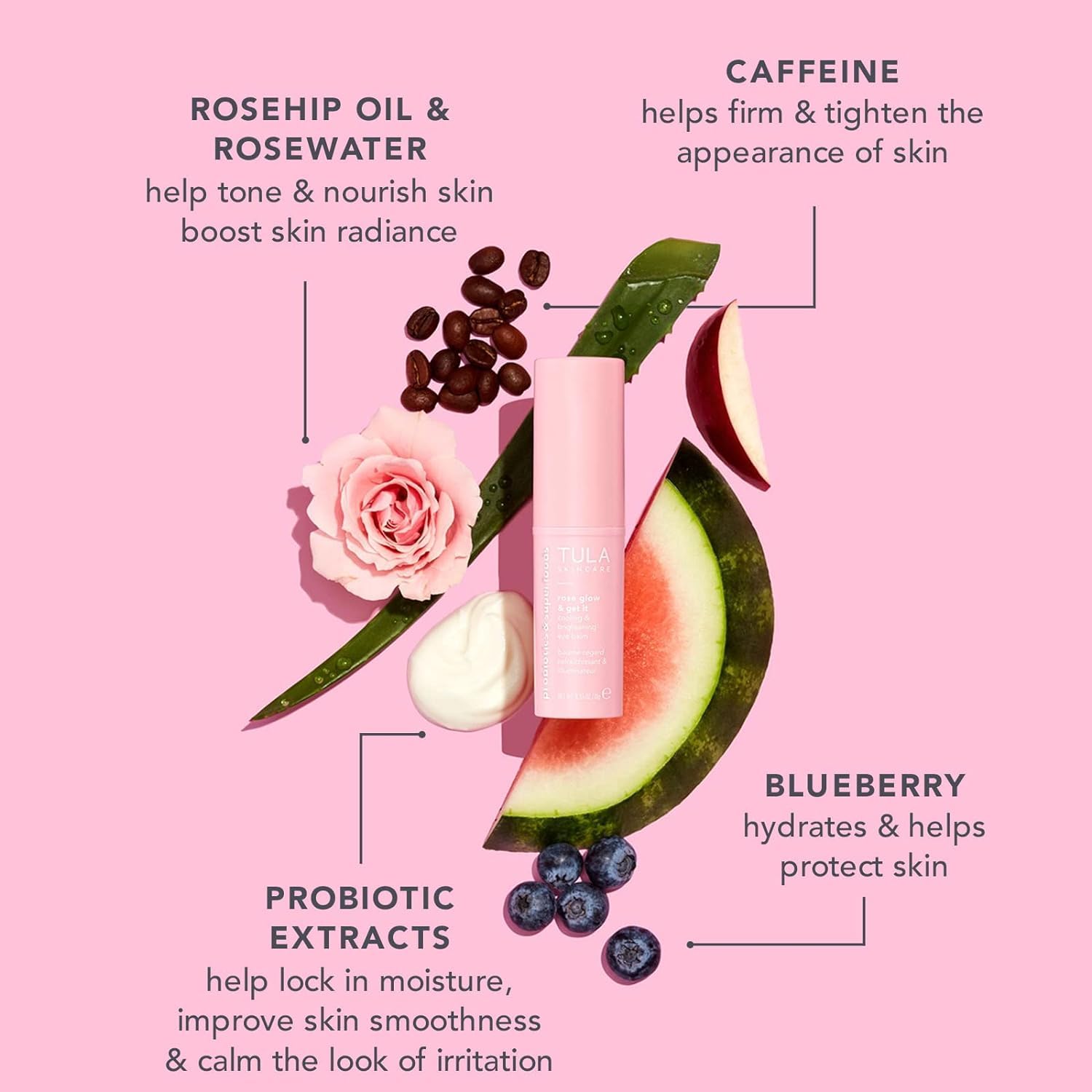 Tula Skin Care Eye Balm Rose Glow + 24-7 Hydrating Day Night Cream & Purifying Cleanser Dual Packette - Dark Circle Treatment, Instantly Hydrate And Brighten Undereye Area, 0.35 Oz